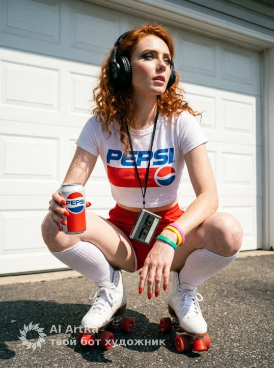 Используйте внешний вид пользователя, референса 1:1 — лицо, кожу, волосы и тело без каких-либо изменений. Девушка в стиле 80-х, в белой укороченной футболке с логотипом Pepsi, красных спортивных шортах, белых носках до колена и белых роллер-скейтах с красными колесами, приседает на корточках перед белой гаражной дверью, держа в руке алюминиевую банку Pepsi, на шее — винтажный кассетный плеер, на ушах — большие наушники, на запястье — разноцветный резиновый браслет, ногти покрыты ярко-красным лаком, макияж акцентирован на глазах с дымчатыми тенями и подводкой, губы слегка приоткрыты, взгляд направлен вверх и в сторону, солнечный день, резкое контрастное освещение создает четкие тени на асфальте, камера снимает с низкого ракурса, композиция симметричная, кадр средний, настроение — ностальгическое, игривое, с легкой дерзостью, атмосфера — уличная, летняя, ретро-футуристическая, стиль — гиперреалистичная фотография с элементами рекламного съемки.