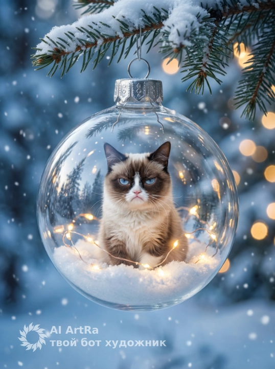 Прозрачная стеклянная рождественская игрушка, висящая на заснеженной ветке ели. Внутри игрушки сидит мой питомец с прилагаемой фотографии. Он сидит на мягком слое снега, вокруг которого светятся крошечные теплые огни. Стеклянная игрушка идеально круглая, с реалистичными отражениями и серебряной металлической крышкой.