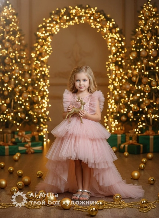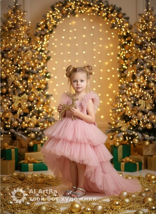 A full-length portrait of a young girl in a festive pink dress, holding a golden reindeer figurine, looking at the camera, amidst luxurious Christmas decorations. The angle is at eye level, a festive composition. She is wearing a layered pink tulle dress with ruffled sleeves and an asymmetrical hem, knee-length in the front, floor-length heels, and simple silver sandals. She holds a small, delicate golden reindeer figurine. The floor is scattered with numerous shiny golden Christmas ornaments and delicate garlands. A luxurious and festive indoor studio setting with a Christmas theme. In the background are two large, beautifully decorated Christmas trees with warm golden lights and ornaments, as well as a majestic arch adorned with golden lights and garlands. Gift boxes in green and gold are visible. Soft, warm, and magical lighting, primarily from golden Christmas lights, creates a rich, dreamy bokeh. Additional soft, diffused studio lighting from the front gently illuminates the girl, creating soft highlights and minimal shadows. Shot with an 85mm portrait lens, photorealistic.