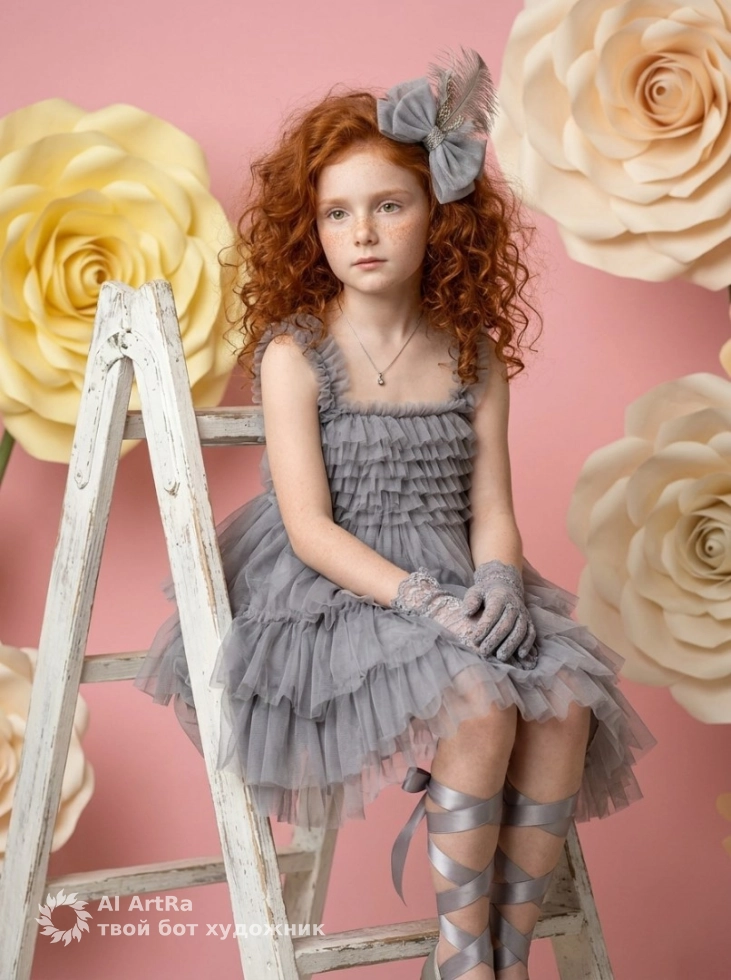 Представьте себе сказочный портрет, в котором ваша маленькая принцесса сидит на высокой лестнице, окруженная мягкими пастельными оттенками и яркими декоративными цветами. Этот образ наполнен нежностью и мечтательностью — идеальное решение для создания уникального контента!