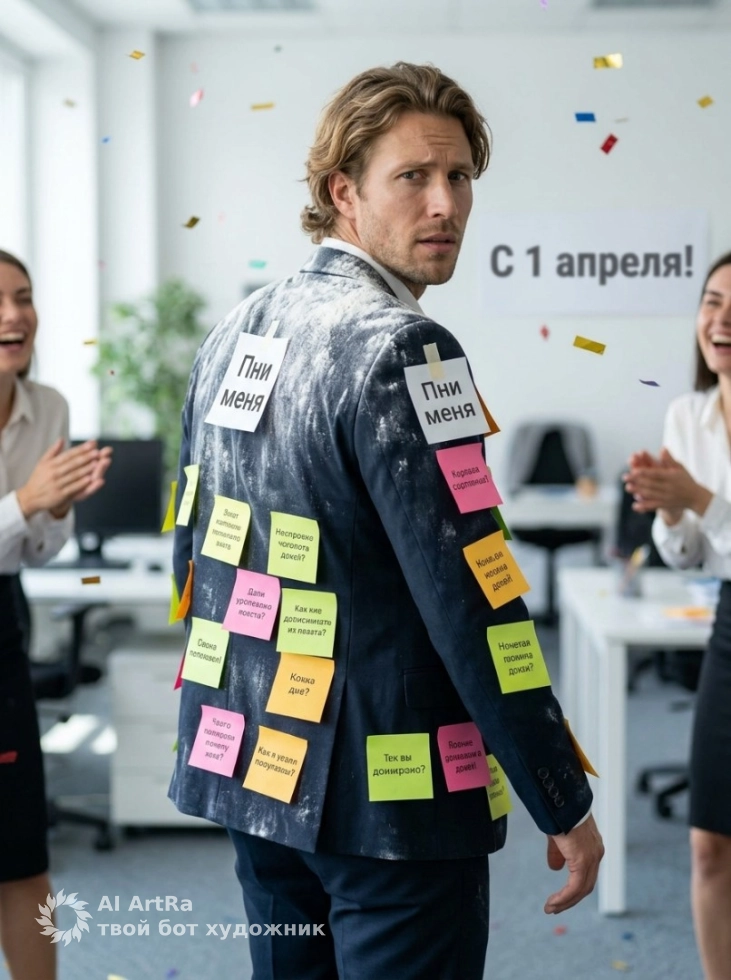 Портрет мужчины в костюме с первоапрельскими шутками