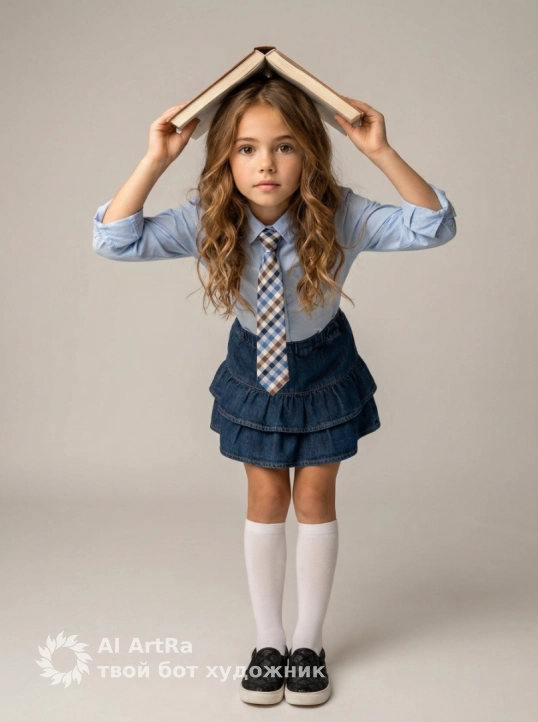 Не меняя внешности ребенка с фото, сцена в мягком нейтральном освещении создаёт уютную атмосферу. Ребенок стоит в полный рост на светло-сером фоне, перед камерой, держа раскрытую книгу над головой как крышу. Тело слегка наклонено вперёд, руки вверх, ладони уверенно охватывают корешки, пальцы касаются страниц. На нём светло-голубая рубашка с длинными рукавами, подвернутыми до локтей, клетчатый галстук с синим, белым и коричневым контрастирует с рубашкой. Юбка из тёмного денима с двумя оборками, белые гольфы до середины голени, чёрные слипоны с белой подошвой и узорами подчёркивают живость ребёнка. Лицо с крупными глазами и лёгкой улыбкой смотрит в объектив, создавая искреннее настроение. Волосы с лёгким светом для объёма и естественности. Слабые тени на фоне и полу подчеркивают форму, создавая кинематографичную глубину. Атмосфера игры и невинности сочетается с тонким освещением, фотореалистичное изображение, высокая детализация, 8K.