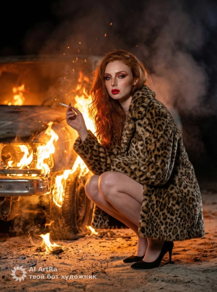 Представьте себе потрясающий образ: вы рядом с горящим автомобилем, в атмосферной ночной съёмке, где каждое движение и игра света делают кадр драматичным и запоминающимся. Такой образ идеально подойдёт для вашего личного бренда, социальных сетей и создания контента — от аватарок до постов. Вы сможете рассказать свою визуальную историю через качественные изображения, которые отразят вашу уникальность.