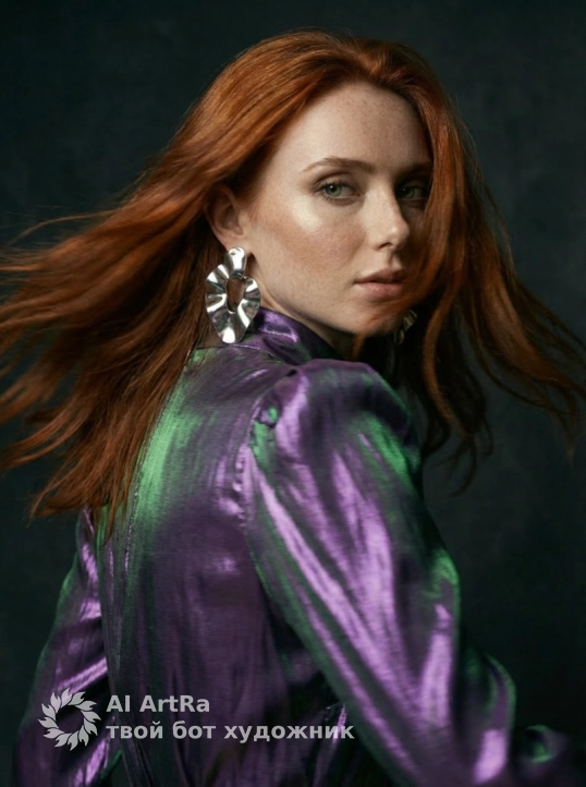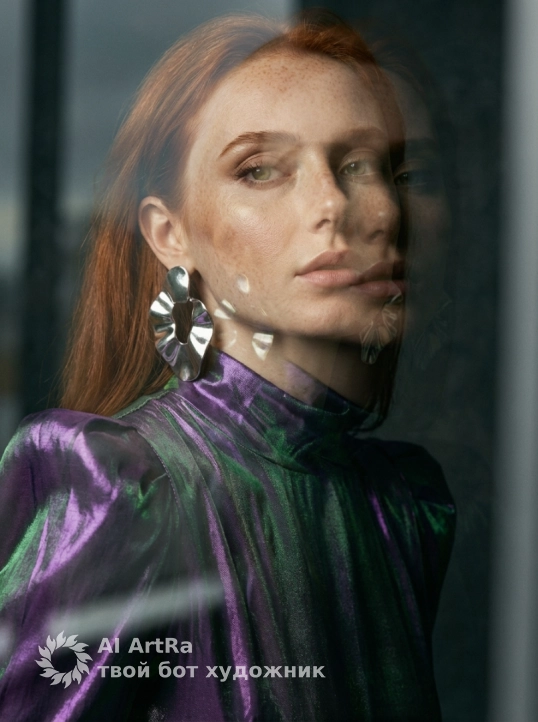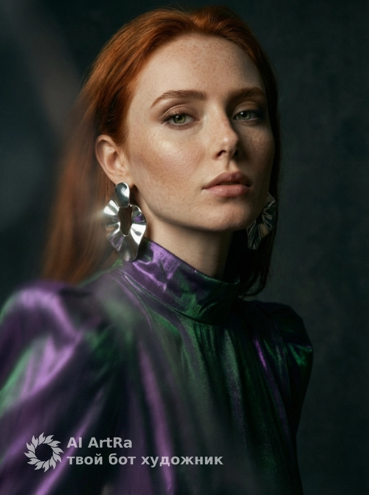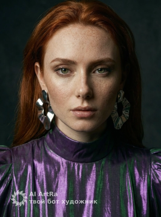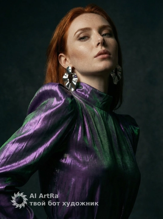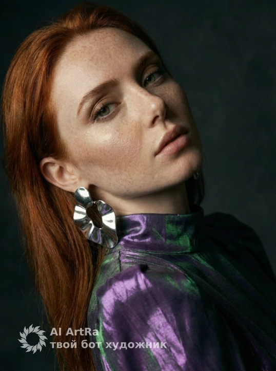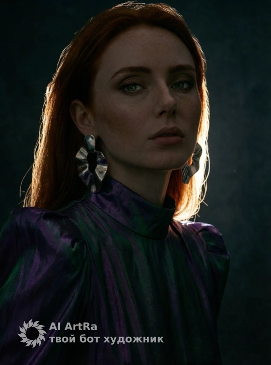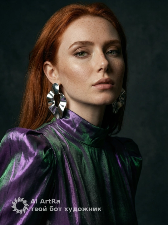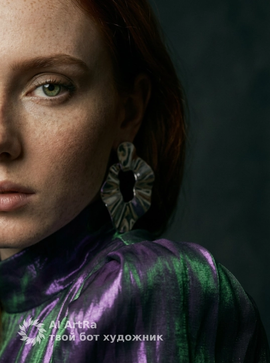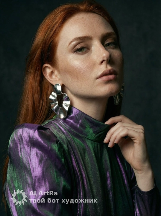 editorial fashion photography, russian-looking woman, 80s glamoratti aesthetic, oversized metallic earrings, sculptural shoulders, glossy fabrics, dramatic studio lighting, confident pose, rich color contrast, visible skin pores, cinematic shadows, luxury fashion editorial look