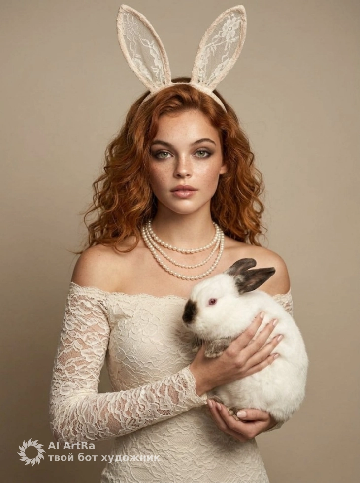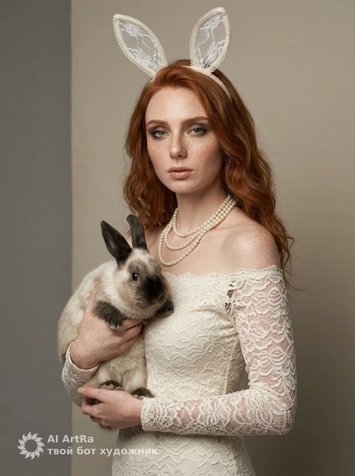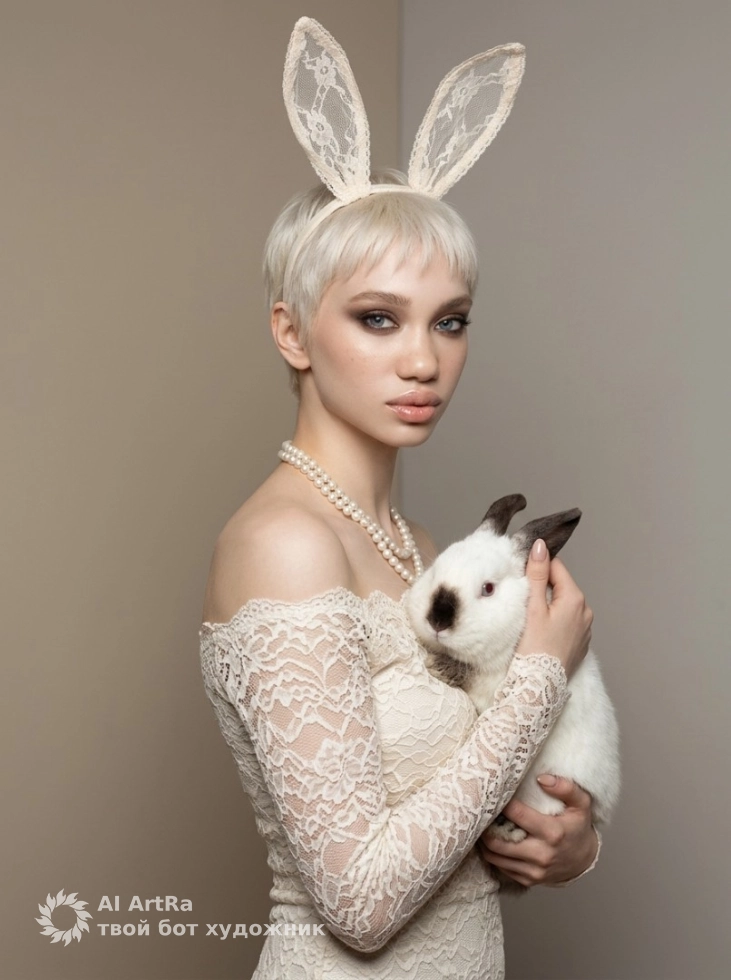 Портрет в кружевном платье с кроличьими ушами и кроликом