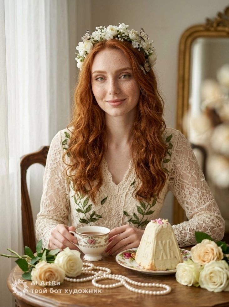 Каждый момент жизни достоин отражения в искусстве. Вдохновитесь атмосферой винтажной чайной комнаты и получите волшебный портрет, который может стать основой вашего личного бренда. Нежные детали, такие как венок из белых цветов и мягкий свет, создадут романтичную атмосферу, идеально подходящую для ваших социальных сетей и аватарок.