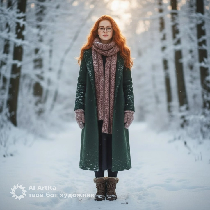 Волшебный и очаровательный портрет женщины в заснеженном пейзаже. Она одета в уютное и стильное зимнее пальто, шарф и варежки. Её волосы усыпаны снежинками, а щеки розовые от холода. Она окружена заснеженными деревьями и нетронутым белым пейзажем. Освещение мягкое и прохладное с оттенком тепла от зимнего солнца. Общее настроение - это чудо и безмятежность. сохрани очки и рыжие волосы и лицо