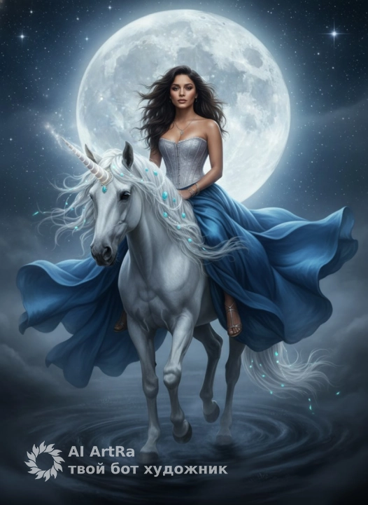 Используйте внешний вид пользователя, референса 1:1 — лицо, кожу, волосы и тело без каких-либо изменений. Девушка с распущенными ветром волосами, облачённая в элегантный корсет с косточками и пышную синюю юбку, свободно струящуюся в воздухе, сидит верхом на белоснежном единороге с изящным рогом и украшенной бирюзовыми камнями гривой; на её лице — тонкий, драматичный макияж с акцентом на глаза и губы, ногти короткие, ухоженные, без лака; на шее — тонкая цепочка с подвеской, на запястьях — тонкие браслеты, на ногах — нежные босоножки с ремешками; единорог идёт вперёд, его копыта едва касаются тёмной, туманной земли, на фоне — огромная луна, окутанная звёздами и туманностью, создающая мистическое, сказочное настроение; стиль — фотореалистичность с высокой детализацией 8К, мягким светом, исходящим от луны и рога единорога, и глубокими тенями; ракурс — низкий, с лёгким подъёмом камеры, фокус на фигуре девушки и голове единорога, масштаб — средний план, охватывающий всю фигуру и часть фона; атмосфера — волшебная, загадочная, немного меланхоличная, с ощущением движения и ветра, развевающего ткань и гриву.