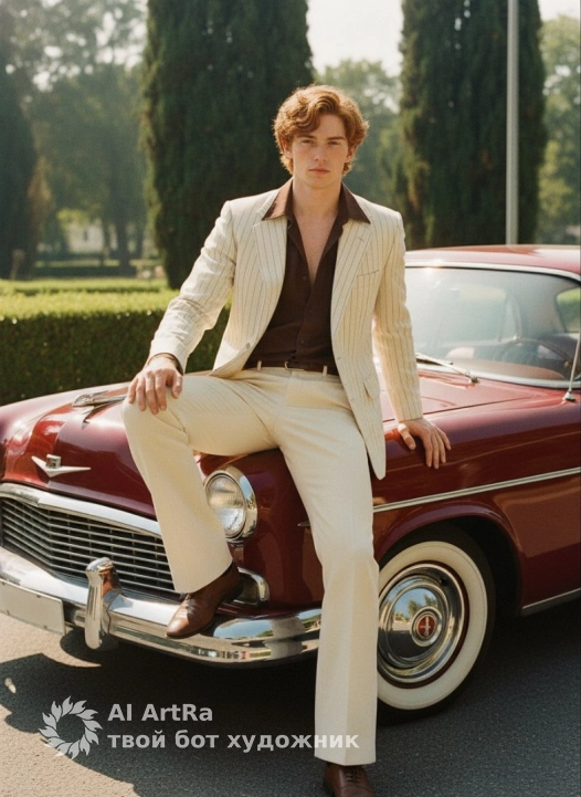 Vintage 1970s Bollywood-inspired photograph, stylish man sitting casually on the hood of a random vintage classic car, royal-colored car (deep maroon, royal blue, emerald green, mustard yellow), chrome details, polished metallic body, wide whitewall tires, sunlight reflections, tall green trees and hedges in background, warm grainy 1970s film tones, retro cinematic vibe, preserve exact face from the input selfie, preserve identity, facial features, skin texture, hairstyle, expression, head shape, body proportions, cream pinstriped blazer, cream bell-bottom trousers, dark brown open-collar shirt (top buttons open), brown formal shoes, confident mafia-style look, natural integration of preserved face with styled body, soft shadows, vintage color palette, subtle film grain, classic analog photography look, sharp focus on face, no beautification, no distortion, no age change, no makeup changes, no facial reshaping, maintain original likeness. Camera: 50mm vintage lens look, shallow depth of field, natural sunlight, slight vignette. Rendering: high detail, crisp edges, realistic textures, cinematic film grain.