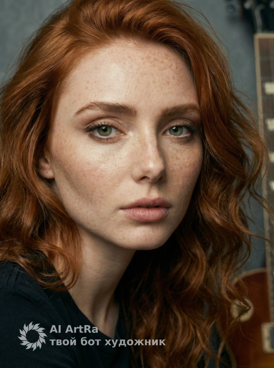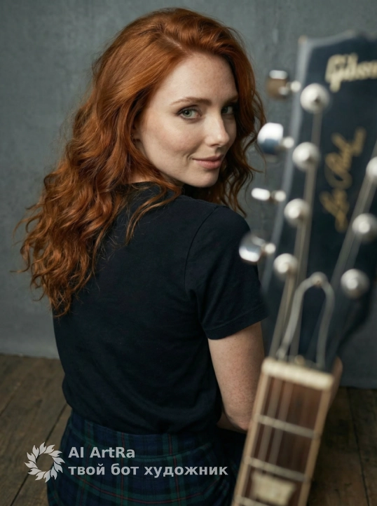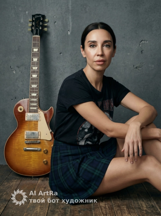 Используйте внешний вид пользователя, референса 1:1 — лицо, кожу, волосы и тело без каких-либо изменений. На изображении — женщина в сидячей позе на деревянном полу, ноги согнуты в коленях, одна ступня слегка выдвинута вперед, взгляд направлен прямо в камеру с легкой задумчивой интонацией; на ней черная футболка с приглушенным графическим принтом и короткая клетчатая юбка темно-синего и зеленого оттенков, рядом — классическая электрогитара Gibson Les Paul с градиентным солнечным финишем, белой грифовой вставкой и хромированными элементами; макияж естественный, с акцентом на глаза — подводка и тушь, губы с матовым оттенком; ногти короткие, ухоженные, без лака; украшений нет; фон — текстурированная стена серо-графитового цвета с мелкими брызгами и неровностями, создающими промышленную атмосферу; освещение мягкое, студийное, с боковым источником света, подчеркивающим объем тела и гитары, тени мягкие, теплые; цветовая палитра сдержанная, с доминированием коричневых, серых и темно-синих тонов, создающих ностальгическое, немного рок-н-ролльное настроение; стиль — высокореалистичная студийная фотография с кинематографическим боке и глубиной резкости; ракурс — средний план, слегка снизу, камера на уровне глаз, композиция симметричная, с акцентом на центральную фигуру и гитару как визуальный контрапункт; атмосфера — спокойная, уверенная, с намеком на творческую интроспекцию.