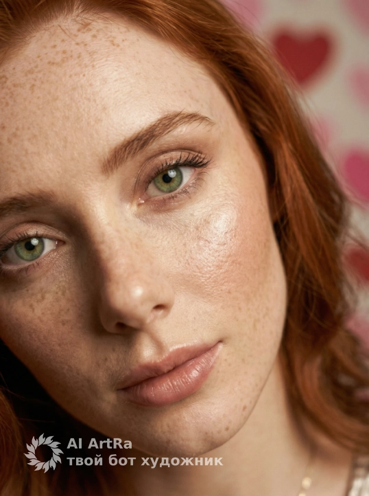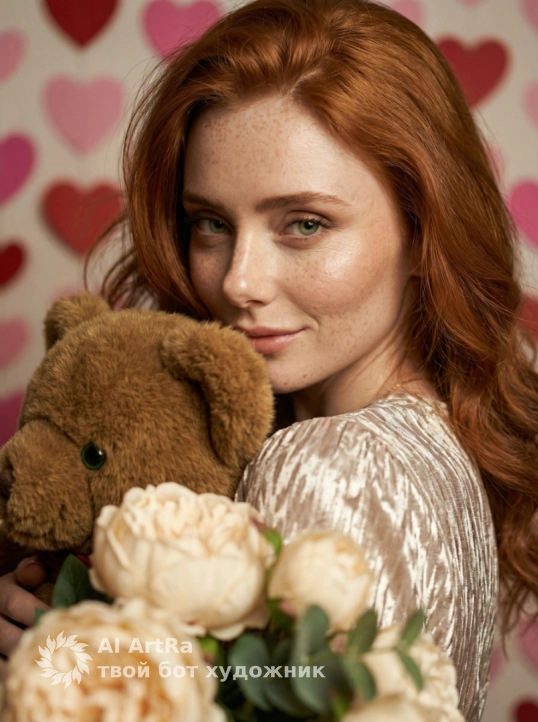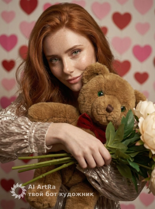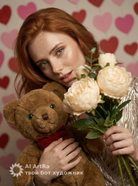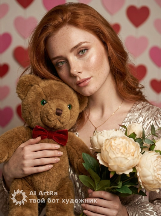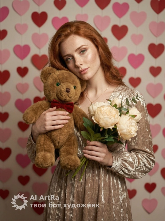 Используйте внешний вид пользователя, референса 1:1 — лицо, кожу, волосы и тело без каких-либо изменений. Женщина в элегантном блестящем платье с текстурным узором, держит в объятиях плюшевого медведя с зелёными глазами и бархатным бантом, в другой руке — пышный букет кремовых пионовидных роз с зелёными листьями; макияж нежный, с акцентом на естественном сиянии кожи и мягком розовом оттенке губ, ногти ухоженные, короткие, без лака; на шее — тонкая цепочка с миниатюрным подвесом; фон — стена с декоративными сердечками разных оттенков розового и красного, слегка размытая; освещение мягкое, рассеянное, с боковым источником, создающее тёплую, нежную, романтическую атмосферу; стиль — гиперреализм 8К, детализация кожи и ткани высокая; ракурс — средний план, слегка снизу, камера на уровне глаз, композиция симметричная, акцент на объятии и взгляде в камеру; поза — полуповорот, руки обнимают медведя и букет, тело слегка наклонено вперёд, выражение лица — спокойное, доброе, с лёгкой улыбкой.