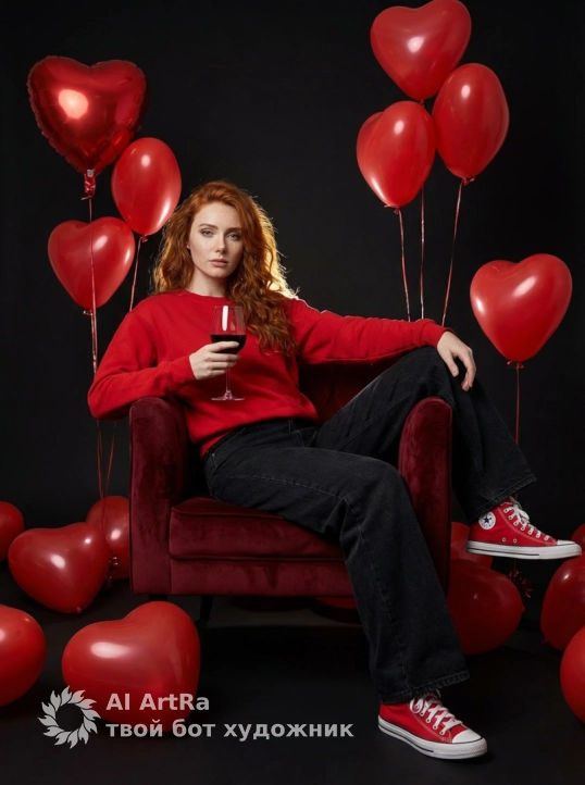 Создай фото с этим референсом. Девушка одета в черные широкие джинсы и красный свитшот. На ногах красные кеды конверс. Девушка сидит в велюровом кресле, в расслабленной позе. В одной руке держит бокал красного вина. На заднем плане множество воздушный шаров в виде красных сердец. Фон: черная циклорама. Девушка смотрит прямо в камеру