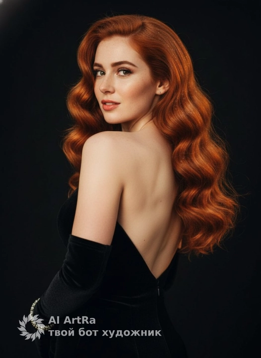Создай ультрареалистичный гламурный портрет девушки, максимально сохранив её внешность 1:1. Ракурс — со спины: она оборачивается через обнажённое плечо, открывая плавную линию спины. На ней чёрное бархатное платье без бретелей с глубоким V-вырезом на спине и длинные бархатные оперные перчатки. В кадре заметна блестящая деталь — браслет или кристальное украшение. Выражение уверенное, слегка загадочное, с едва заметной мягкой полуулыбкой. Волосы уложены в объёмные голливудские волны: крупные блестящие локоны спадают по спине. На поверхности волос — лёгкое мерцание, будто припудрены тончайшим сияющим шиммером. Макияж вечерний: гладкая подсвеченная кожа, пышные ресницы, аккуратные брови, губы нежного кораллово-розового оттенка. Свет драматичный, контрастный, с мягким контровым сиянием, подчёркивающим структуру локонов. Фон глубокий чёрный, деликатные тени создают кинематографичность. Глубина резкости малая, акцент на глазах и волосах. Стиль — роскошная бьюти-съёмка в духе суперзвёзд 90-х: высокое разрешение, лёгкое плёночное зерно, тёплый тон, бархатные тени и мягкое свечение хайлайта.