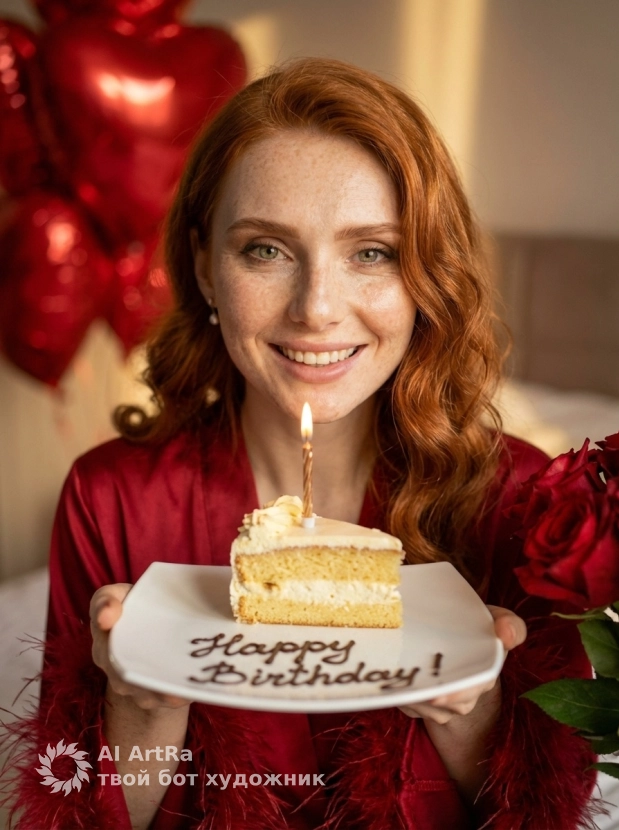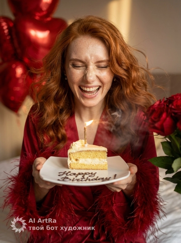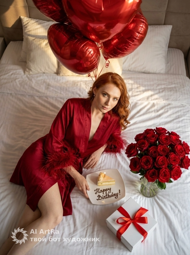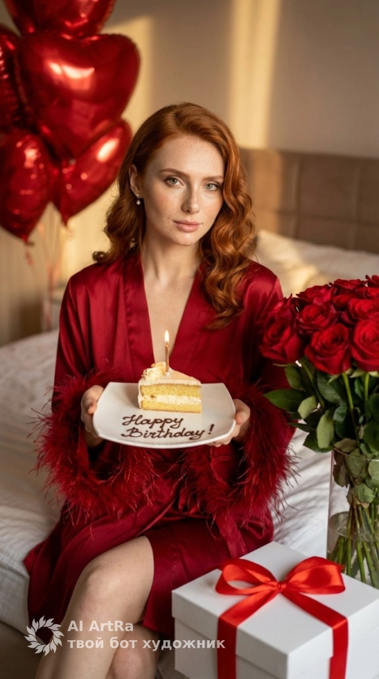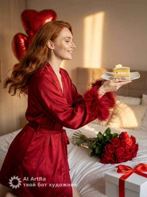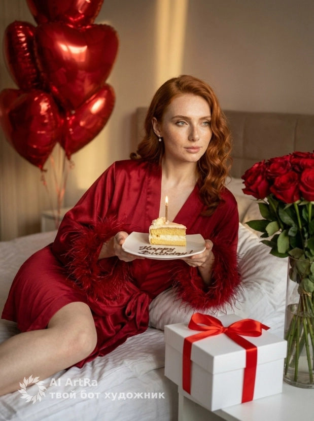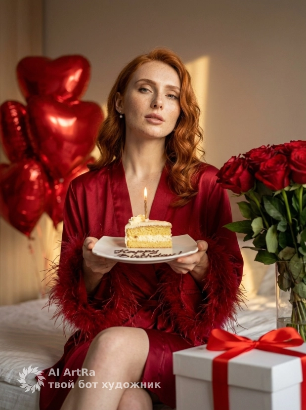 Представьте, как вы позируете в роскошном алом халате в уютной спальне, наслаждаясь своим днем. На столе рядом с вами – нежный кусочек торта с свечкой и букет красных роз, создающих идеальную романтическую обстановку. Безупречный стиль, детали, освещение - мы сделаем всё возможное для создания вашей идеальной картинки.