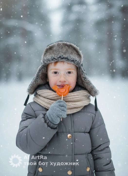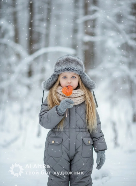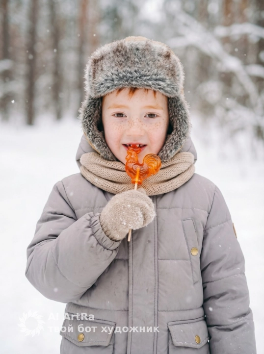 Используйте внешний вид пользователя, референса 1:1 — лицо, кожу, волосы и тело без каких-либо изменений. Маленький ребёнок в зимнем пуховом комбинезоне серого цвета с золотистыми пуговицами на карманах, в тёплой шапке-ушанке с серым меховым отворотом и бежевом вязаном шарфе, держит в перчатке оранжевую леденцовую конфету в форме петушка на палочке, прижимая её к губам; фон — мягко размытый зимний лес в снегу с падающими снежинками, освещение — рассеянное дневное, холодное, с нежными бликами на снегу и лице, цветовая палитра — пастельные серые, бежевые и оранжевые акценты, атмосфера — трогательная, уютная, зимняя сказка; камера — средний план, фронтальный ракурс, композиция центрирована на лице и конфете, глубина резкости мелкая, акцент на деталях одежды и текстуре снега, настроение — нежное, безмятежное, с лёгкой игривостью.