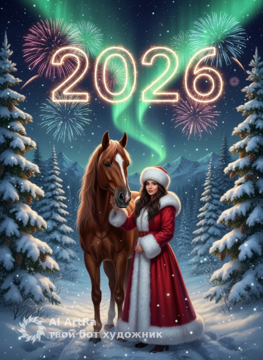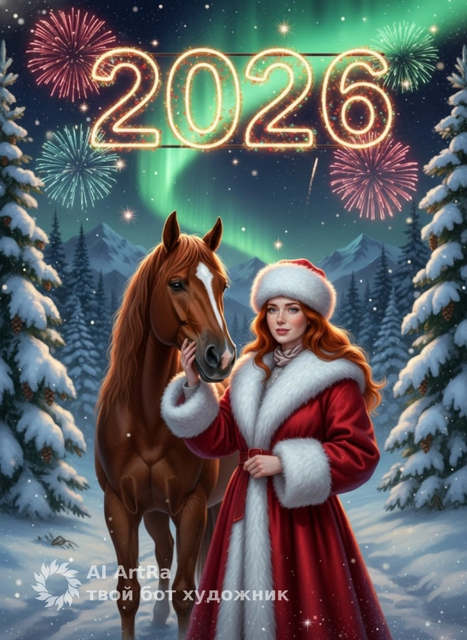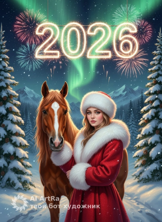 Используйте внешний вид пользователя, референса 1:1 — лицо, кожу, волосы и тело без каких-либо изменений. Цифровая живопись в гиперреалистичном стиле с кинематографической детализацией, изображающая зимнюю новогоднюю сцену: в центре композиции — женщина повернута полностью к нам лицом в пышном красном пальто с роскошной меховой отделкой воротника и манжет, меховой шапке, гладит лошадь; рядом — благородная рыжая лошадь с густой гривой и белым пятном на лбу, спокойно стоящая на снежной тропе. Фон: сказочный зимний лес с заснеженными елями, с шишками на ветвях, далёкими горами, озаренными зелёным северным сиянием на ночном небе, усыпанном снежинками и звездами; над сценой — огромные светящиеся цифры «2026», выполненные в стиле неоновых гирлянд, с взрывающимися вокруг радужными фейерверками. Освещение — контрастное, с теплым свечением огней, создающим праздничное сияние на снегу и подчеркивающим объем меха, блеск глаз лошади и текстуру ткани пальто. Атмосфера — волшебная, торжественная, наполненная ожиданием чуда, с глубоким фокусом на детали: капельки инея на воротнике, искры в фейерверках, узоры снежинок в воздухе, отражение огней в глазах лошади. Камера — средний план с низким ракурсом, женщина крупным планом хорошо видны черты лица, акцентирующий высоту елей и динамику сияния в небе, композиция выстроена по золотому сечению, где цифры «2026» доминируют в верхней части, а персонажи гармонично вписаны в снежный пейзаж с мягким боке на дальнем плане.