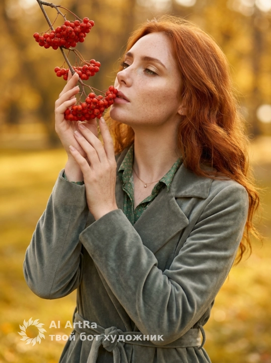 Используйте внешний вид пользователя, референса 1:1 — лицо, кожу, волосы и тело без каких-либо изменений. Фотография в стиле элегантного, мягкого реализма с теплым, рассеянным освещением, создающим нежную, мечтательную атмосферу; главный объект — женщина в позе полупрофиля, слегка наклонившая голову вверх, нежно прикасаясь губами к ветке с ярко-красными ягодами рябины, её руки аккуратно обхватывают ветку, пальцы слегка изогнуты, ногти ухоженные, без яркого лака; макияж естественный, с акцентом на золотисто-перламутровые тени на веках и нежно-розовые губы; на шее — тонкая цепочка с небольшим подвесом, едва заметная под воротником; одежда — длинное серо-зелёное пальто с текстурой велюра, завязанное на талии поясом, под ним виден зелёный воротник рубашки с мелким узором; фон — размытая осенняя листва и ветки с ягодами, создающие глубину и природную рамку; ракурс — средний план, снятый чуть снизу, камера фокусируется на лице и руках, подчеркивая интимность момента; цветовая палитра — теплые красные и зелёные тона с мягким контрастом, настроение — спокойное, созерцательное, с оттенком ностальгии.