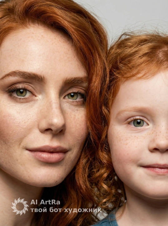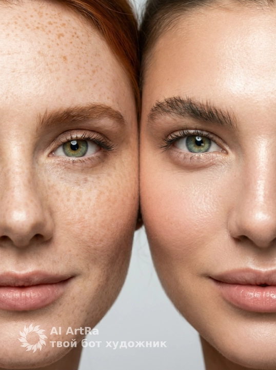 Ультрареалистичный студийный макропортрет в светлых тонах. Черты лица не изменены. На фотографии два человека, прижавшись щеками друг к другу, в кадре видна только половина лица каждого, оба смотрят прямо в камеру с мягкими улыбками. Снимок сделан профессиональной камерой (85 мм f/2.0, ISO 200, 1/160 с). Яркий фронтальный свет создает резкие тени и четкие блики. Чистый студийный фон, малая глубина резкости, высокая детализация кожи, красивая гладкая кожа. Редакционный стиль обработки изображения.