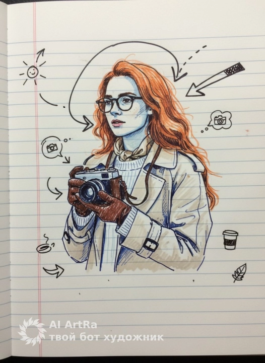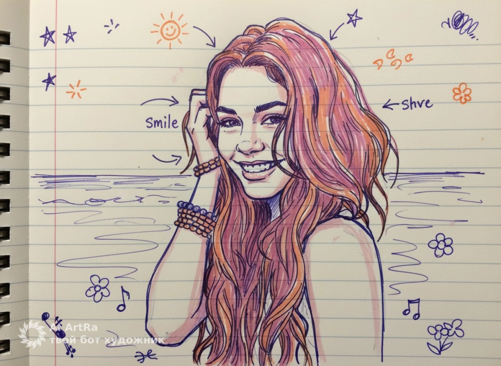 Turn my portrait into a pen-and-marker notebook doodle on ruled paper, with playful arrows and tiny margin sketches. Keep my face recognizable.