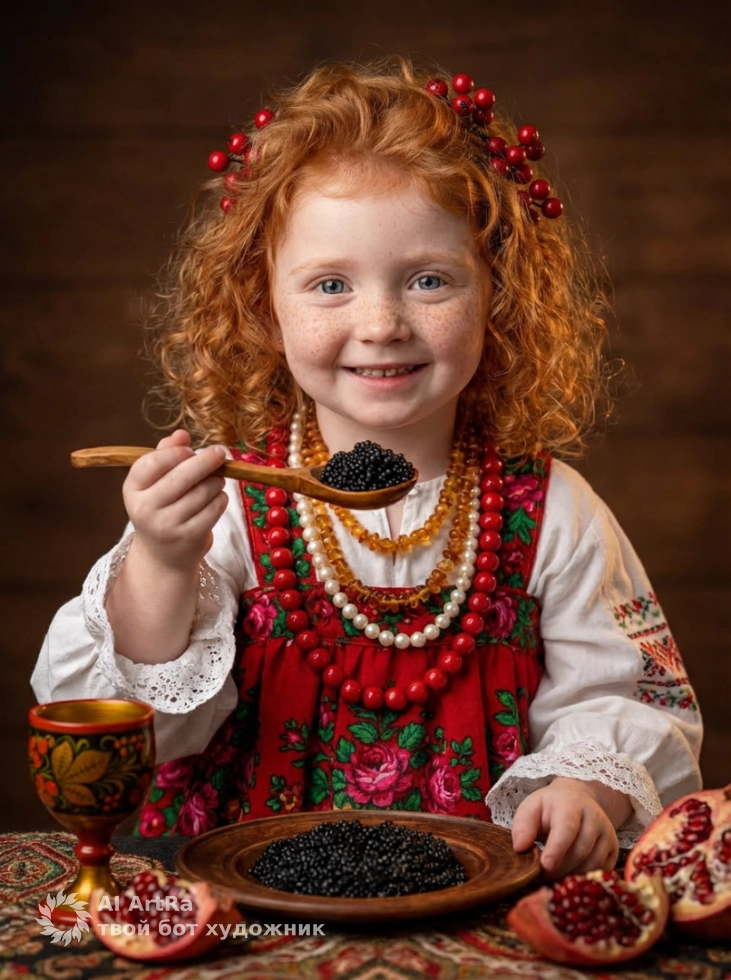 Представьте себе: вы сидите за столом, полным изобилия, в традиционном наряде с богатой вышивкой и яркими бусами, а в руках у вас ложка с черной икрой. Наряд, детали и фоновая атмосфера создают ощущение праздника, уюта и радости. Дайте свободу своей креативности и создайте фотографии, которые будут говорить сами за себя!