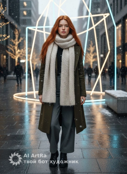Ultra-hyperrealistic winter photo of a stylish young woman standing in a modern city plaza decorated for holidays with large artistic light installations, illuminated trees, and upscale cafés. She looks calmly into the camera, expression confident and chic. No glitter, no blush, no glow — clean matte winter look. She wears a structured dark olive wool coat, thick scarf in cream tones, wide wool trousers, and leather winter boots. Her straight hair moves slightly from wind and falling snow. Background sharp: geometric light sculptures, modern architecture, warm café windows, snow on benches, pedestrians blurred slightly by motion — but background stays detailed. Atmosphere: sophisticated, high-end, youthful, modern winter fashion. Camera: 35mm lens, f/2.0, ISO 250, shutter 1/640, crisp bright winter daylight.