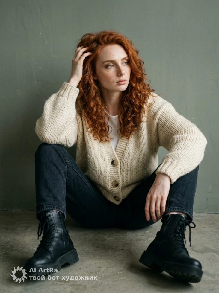 Этот стильный образ с вязаным кардиганом и этническим шармом на фоне серо-зеленой стены создаст атмосферу уюта и уверенности. Такой портрет отлично впишется в ваш имидж и наполнит ваш контент жизнью и эмоциональным откликом.