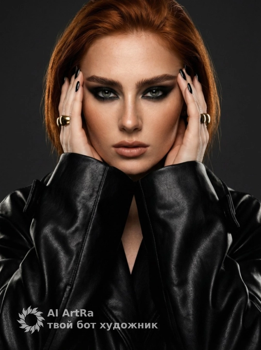 Сохрани внешность и черты лица девушки. Powerful close-up editorial portrait: confident woman in an oversized, voluminous black leather jacket with pronounced leather texture and wide sleeves; hands near the face showcasing black glossy manicure and massive gold rings; strong piercing gaze directly at the camera, thick sharply defined eyebrows, smoky black eye makeup, cheekbone contouring, full lips in a nude-brown shade, natural skin texture with a light tan and bronze blush; high-contrast cinematic lighting with beauty key light and rim light, dark neutral background, shot on Hasselblad in RAW with low ISO, f/4–f/5.6, 1/125–1/160, 80–100 mm, retouching preserving pores.