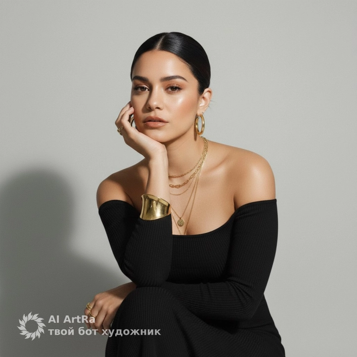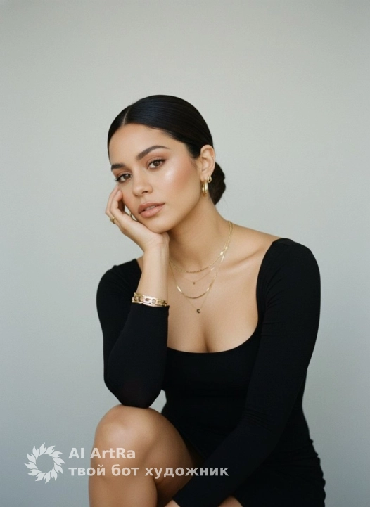 Минималистичный студийный editorial‑портрет: модель с гладко собранными назад волосами (низкий пучок), лёгкий нюдовый макияж, естественные брови и тёплая помада. Внешность без изменений. Одежда — чёрный облегающий топ/платье с открытыми плечами и длинными рукавами. Золотые украшения: тонкие цепочки на шее, массивный браслет, серьги‑кольца, кольца на пальцах. Поза: сидит, локтем опирается на колено, ладонь подпирает щёку; голова слегка наклонена; спокойный уверенный взгляд прямо в камеру. Фон — ровная светло‑серая стена, мягкая падающая тень. Свет — рассеянный, низкий контраст, естественные тона кожи, лёгкая матовая пленочная текстура. Композиция: средний план по талию/бедро, центрирование с небольшим смещением, чистое негативное пространство.