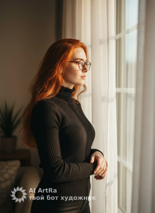 Transform the image into a cinematic indoor portrait near a large window during late afternoon. She is wearing a fitted black turtleneck knit sweater with detailed texture and natural fabric folds. Replace the studio background with a softly lit interior — warm sunlight streaming through sheer white curtains, casting gentle highlights and long shadows across the scene. A faint reflection glows on the glass beside her, adding realism and depth. She stands slightly turned to the side, hands lightly crossed, gaze directed out the window with calm focus. The lighting combines warm sunlight with soft cool ambient tones from the room, creating a delicate cinematic balance. Maintain fine film grain, natural color harmony, and shallow depth of field, with background elements softly blurred. The composition remains non-centered, leaving breathing space toward the window to evoke tranquility and thoughtful atmosphere.