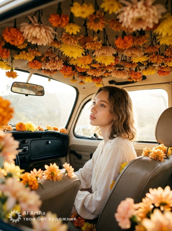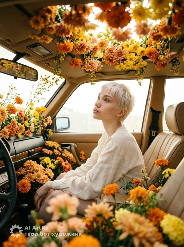 Сюрреалистичный портрет в машине, наполненной цветами