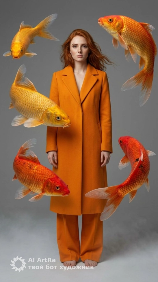 Создание уникального образа никогда не было таким доступным! С помощью нашего сервиса на сайте АРТРА вы можете реализовать свою стильную фотосессию в стиле сюрреализма, где золотые карпы плавают вокруг вас, подчеркивая ваш великолепный оранжевый наряд.