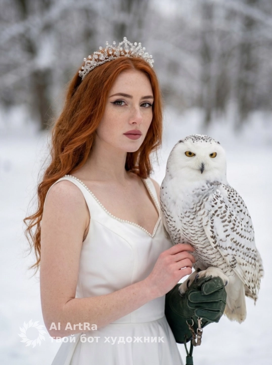 Фотография портрета в высоком разрешении, изображающая центрально расположенную женскую фигуру, занимающую среднюю треть вертикальной рамки на фоне слегка размытого снежного пейзажа, создающего мелкую глубину резкости. У женщины гладкая, фарфоровая ivory кожа с матовым финишем, подчеркивающая четко очерченные черты лица. Ее миндалевидные глаза, подчеркнутые темной подводкой и тушью, смотрят чуть влево от оси камеры. У нее губы, окрашенные в матовый розовый цвет, что создает спокойное выражение. Ее насыщенные волосы ниспадают объемными волнами на правую сторону, занимая одну треть ширины рамки. Она носит изящную тиару из полупрозрачных бусин и серебряных цветочных мотивов на лбу. Одета в безрукавное белое платье с гладким сатиновым финишем, лиф платья имеет вырез в форме сердца и отделку из жемчужных бусин. Левой рукой она держит темно-зеленую кожаную перчатку для соколиной охоты, в то время как правой поддерживает большую снежную сову, расположенную чуть перед ней. Мягкое, рассеянное естественное освещение подчеркивает ее черты, с минимальными тенями и спокойной цветовой палитрой, акцентирующей холодные тона и мягкие текстуры без явных артефактов постобработки. Use the user's appearance 1:1 — face, skin, hair and body without any changes.