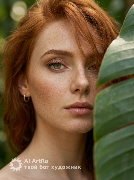 Атмосфера тропического леса или джунглей, листья рядом с камерой создают глубину и рамку вокруг лица.