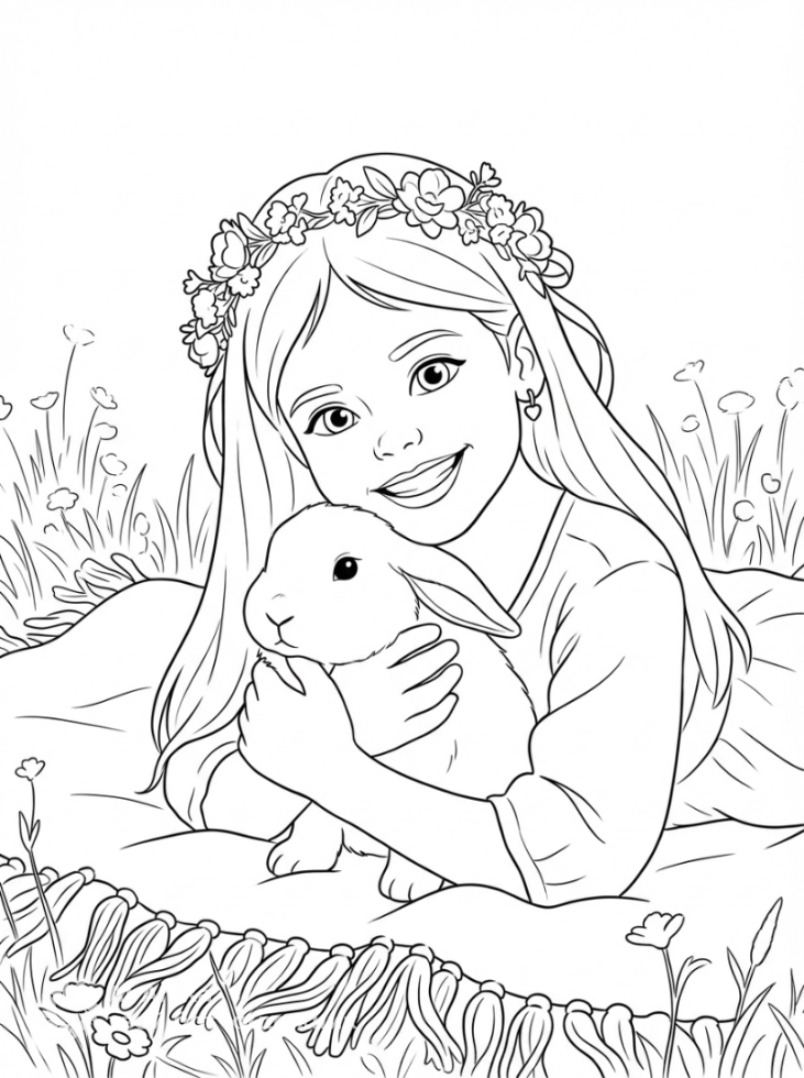 Тёплый миг на лугу: девочка обнимает кролика