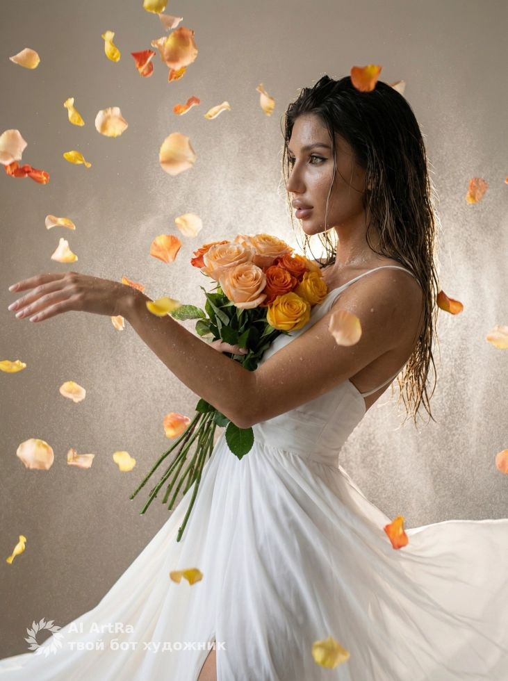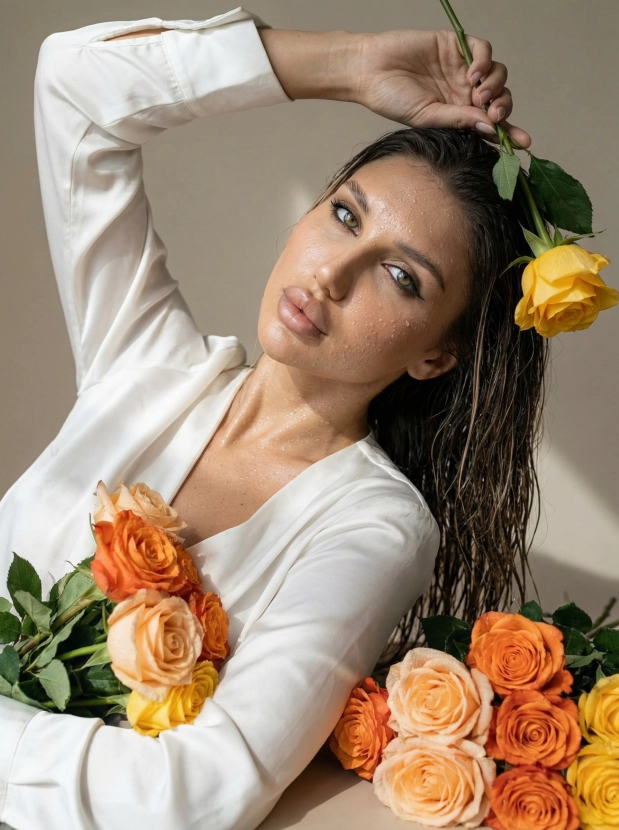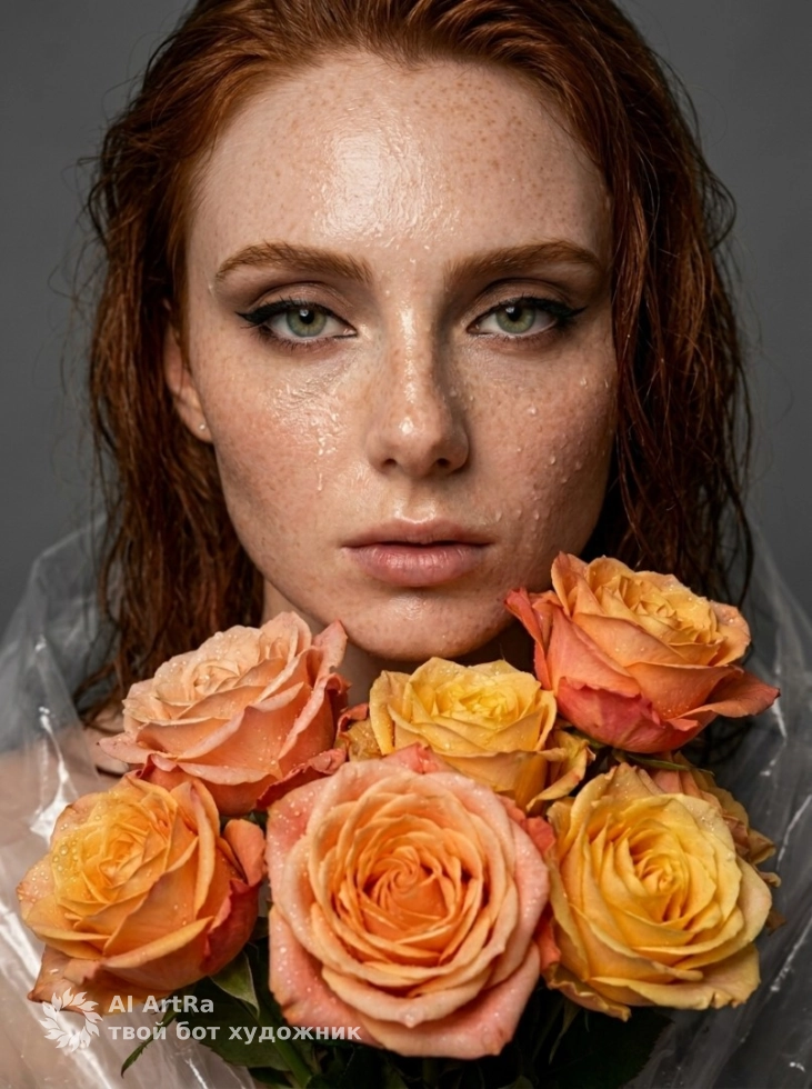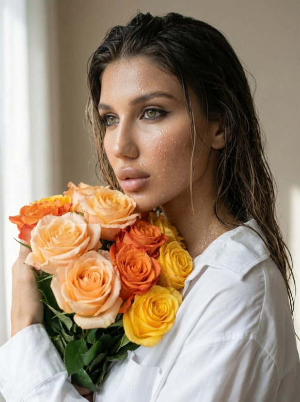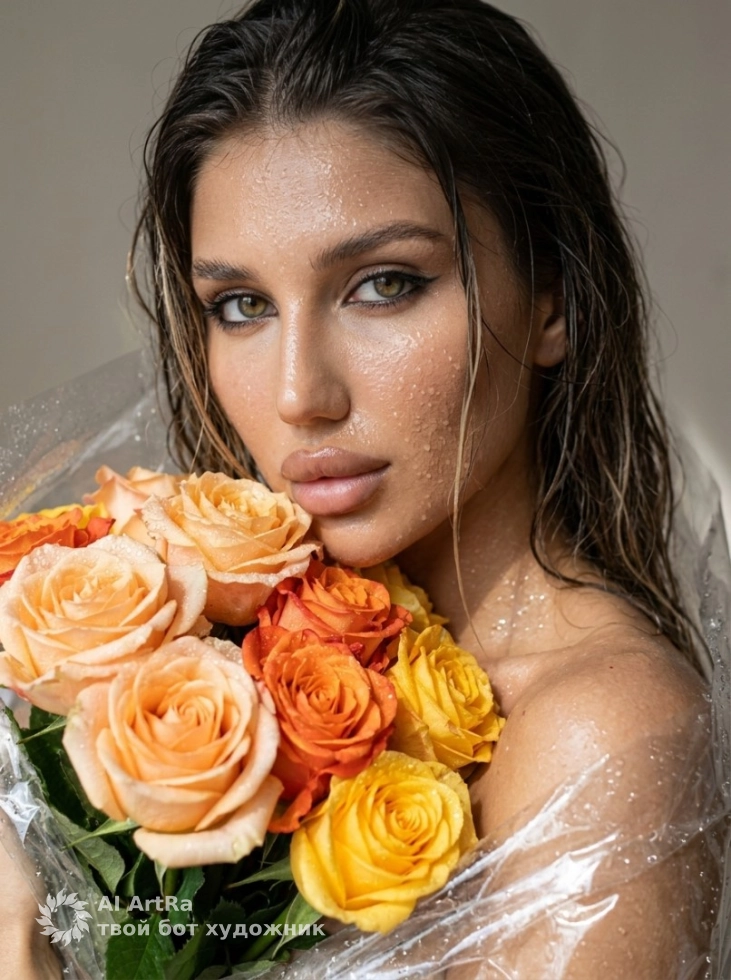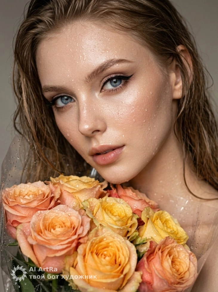 Утренняя свежесть, портрет с влажной кожей и букетом роз