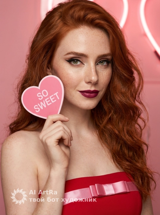 Композиция напоминает рекламную съёмку ко Дню святого Валентина. Образ девушки стилизован под «подарок», а окружение — под праздничную декорацию с романтическими символами: сердечки, розы, признания в любви, воздушные шары и сладости.