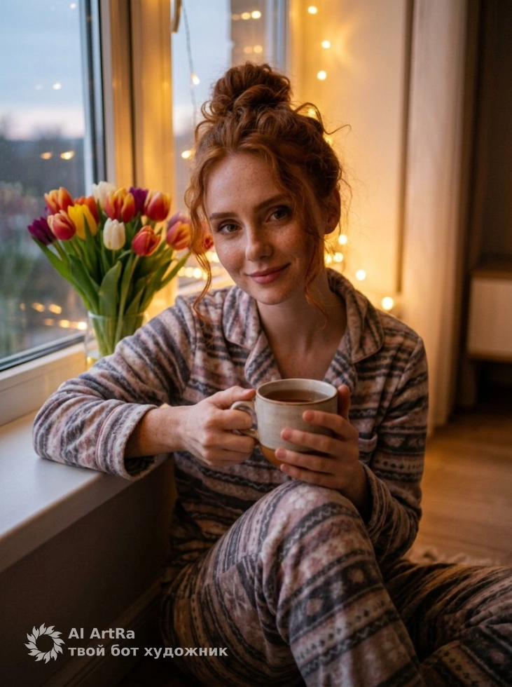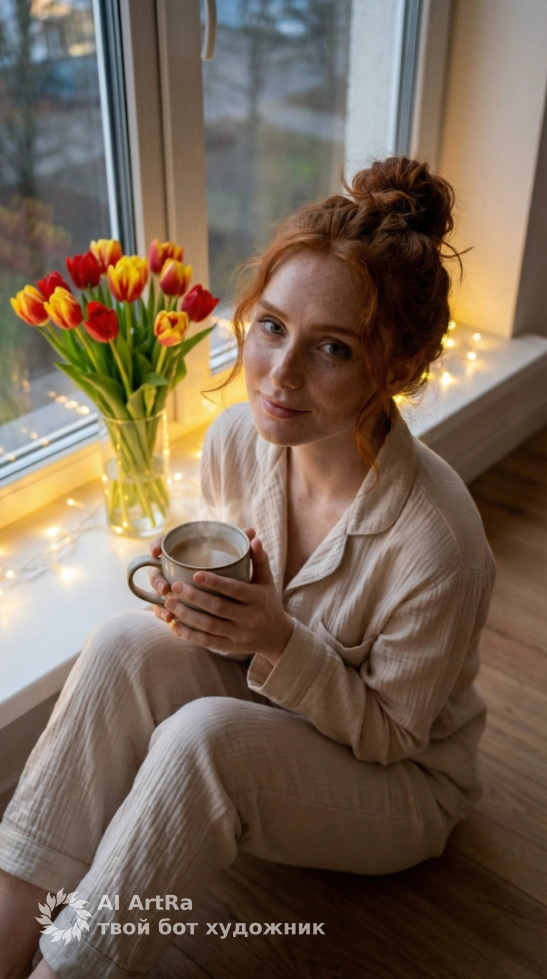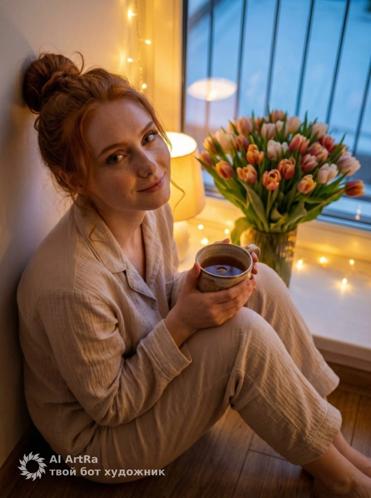 Вечер у окна: чай, тюльпаны и мерцающие огоньки