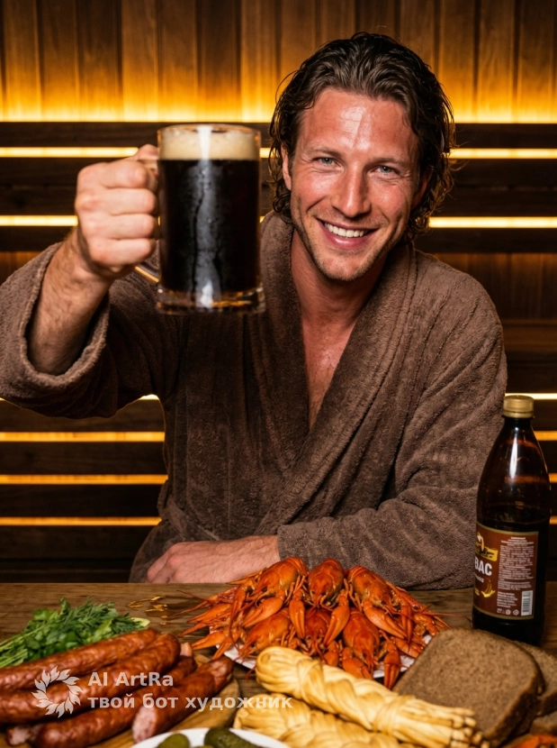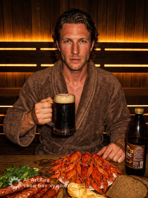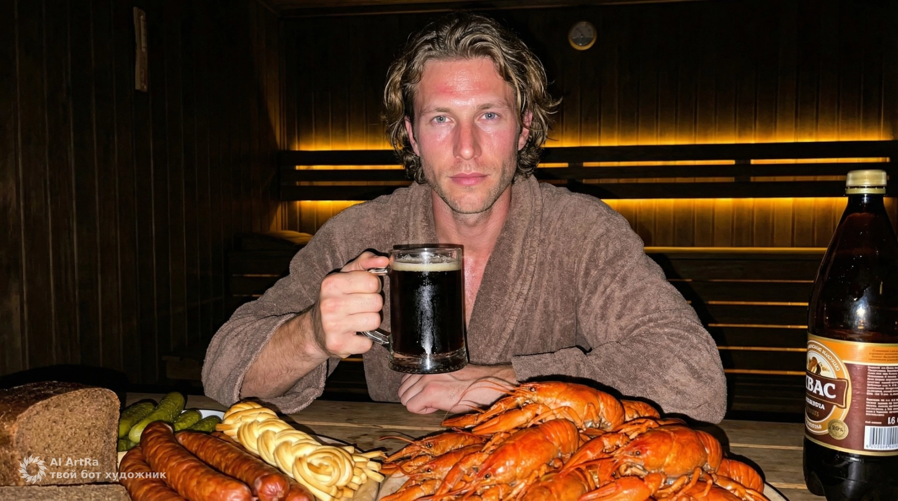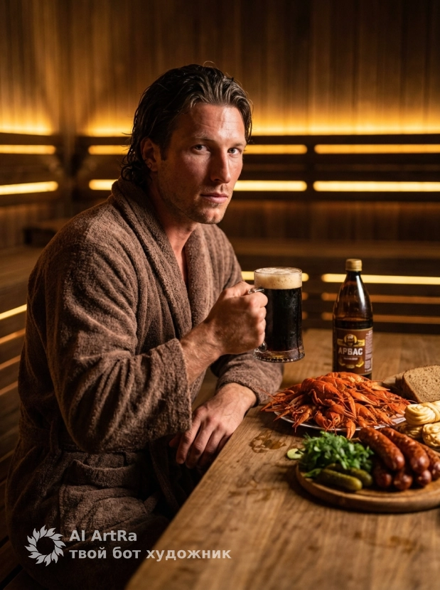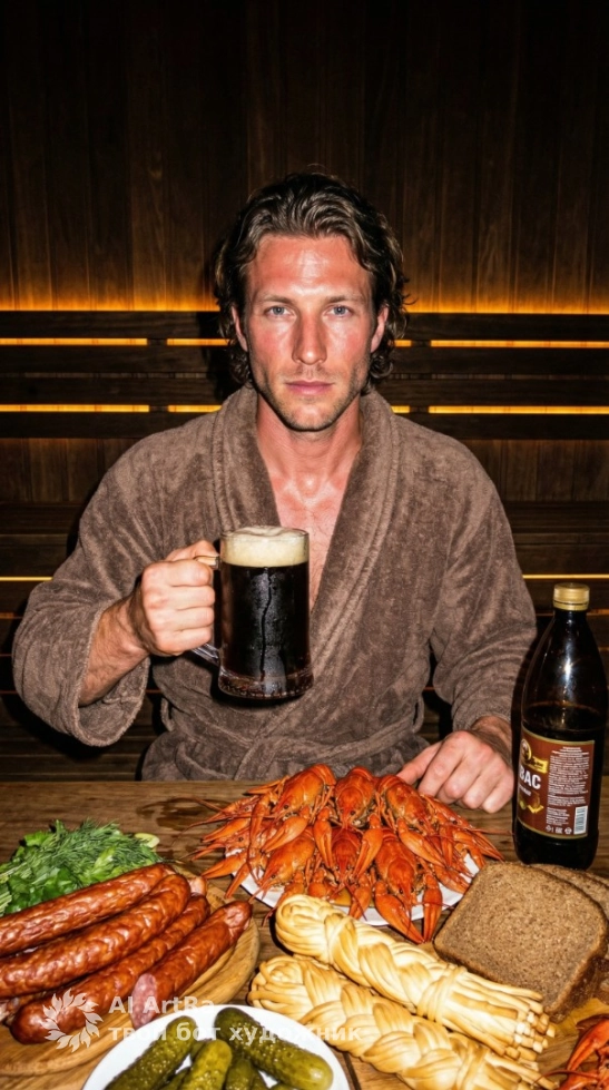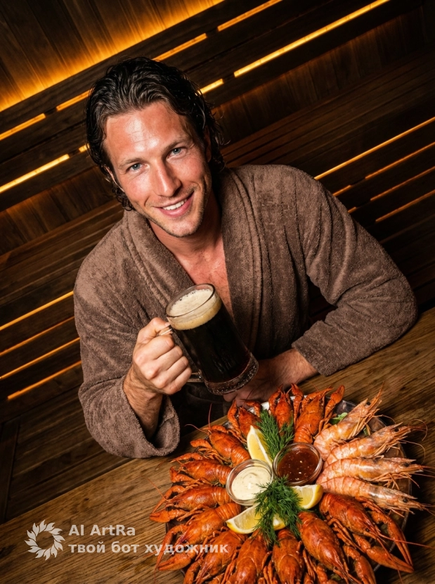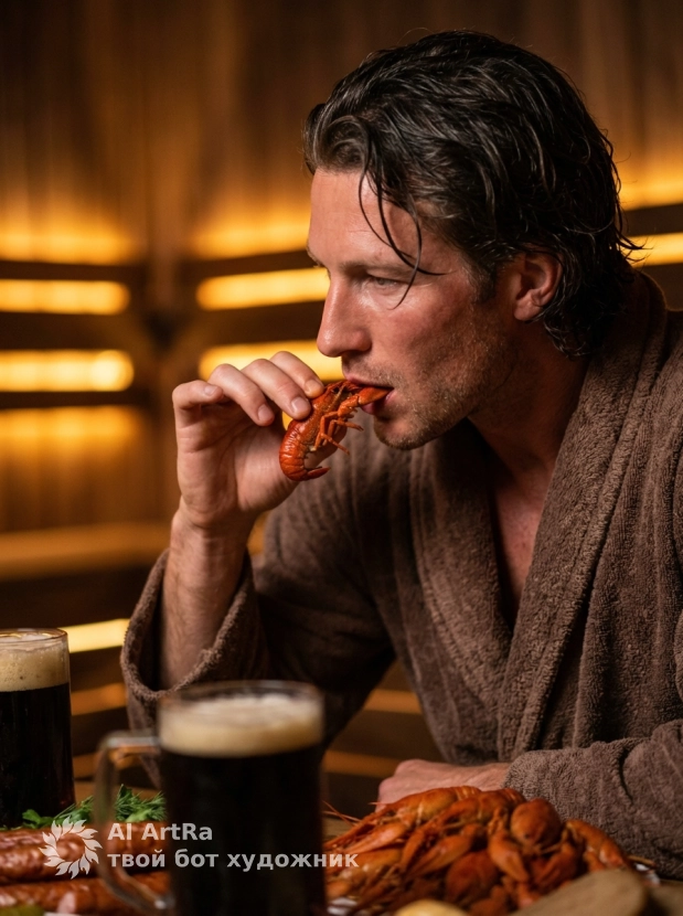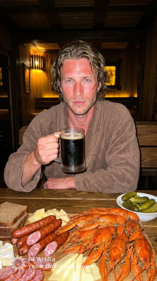 Представьте себе атмосферу уюта и роскоши в глубоком, древесном интерьере. Человек с аутентичным выражением лица, расслабленно сидящий за столом, окруженный изобилием деликатесов и освещенный мягким теплым светом. Такой снимок прекрасно подойдет как для создания нового образа в социальных сетях, так и для оформления личного бренда.
