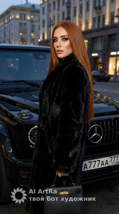Luxury evening fashion editorial, 9:16 vertical, urban atmosphere. КРИТИЧНО: сохранить ТОЧНЫЕ черты лица девушки из референса - идентичные глаза, нос, губы, форма лица, структура костей, тон кожи, все пропорции. Девушка стоит у черного Mercedes-Benz G-Class (характерная квадратная решетка, круглые фары, глянцевый черный кузов, российский номер А777АА 777). Поза: корпус и лицо развернуты на три четверти к камере, смотрит прямо в объектив уверенным соблазнительным взглядом. Средний план от бедер вверх. Наряд: роскошная черная норковая шуба (до середины бедра, объемная, пушистый глянцевый мех, полные рукава), в руке черная кожаная сумка Kelly-style (трапециевидная с замком, gold hardware). Волосы идеально прямые и гладкие, блестящие, распущенные. Макияж вечерний glam: идеальная кожа с сиянием, выраженные скулы, smoky eyes, густые ресницы, пухлые губы в нюдово-розовом с глянцем, четкие брови. Локация: вечерняя городская улица, за ней классические здания с колоннами. Освещение: вечернее теплое - уличные фонари создают золотистое боке на заднем плане, основной свет на лице от студийного источника, температура 3200-4000K, темное небо. Фон размыт: золотистое боке от фонарей, силуэты зданий. Mercedes G-Class: черный глянцевый, квадратные формы, видна передняя и боковая часть. Атмосфера: confident luxury, evening glamour, sophisticated sensuality, status symbol. Цвета: черный доминирует, золотистые огни, теплые тона кожи. Техника: 85mm f/1.4, aperture f/1.8-2.2 для shallow DOF, ISO 800-1600, искусственное освещение с софтбоксом, теплая цветокоррекция, профессиональная ретушь, high resolution, cinematic grading.