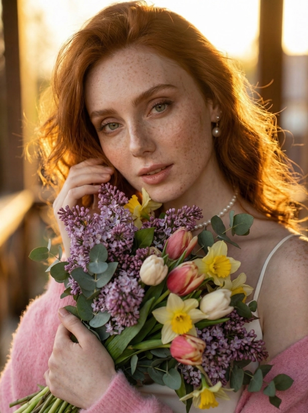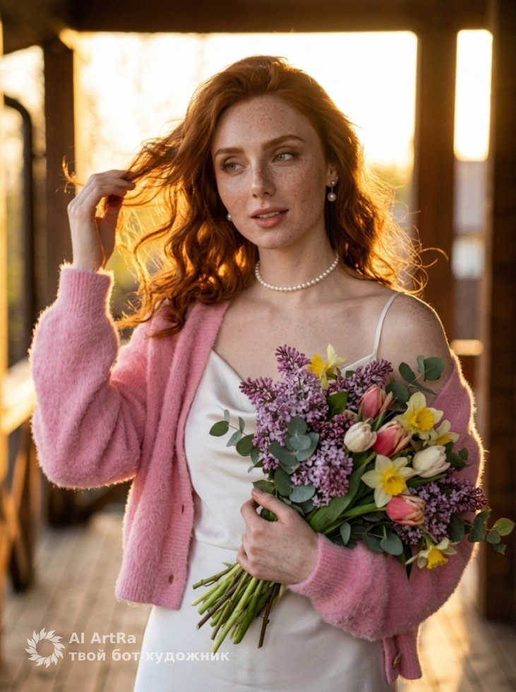 Весенний закат, девушка с роскошным букетом на веранде