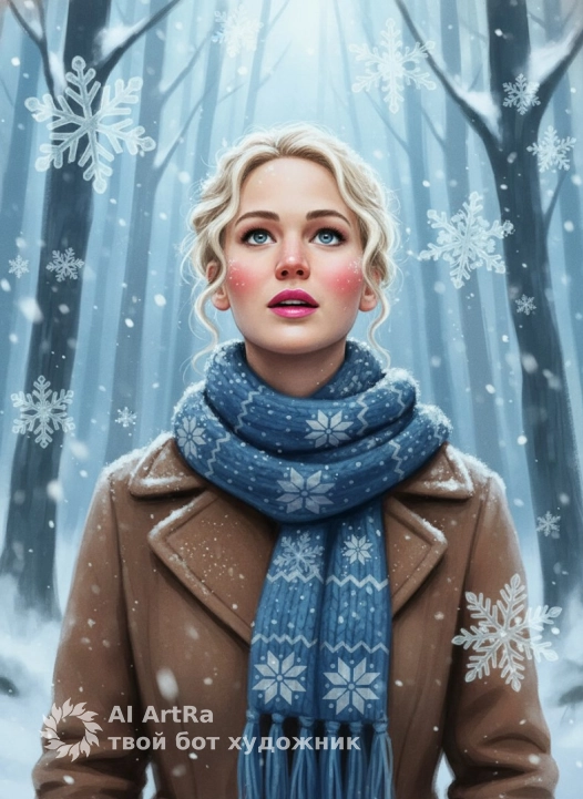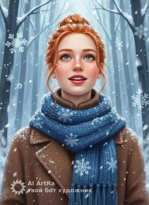 Используйте внешний вид пользователя, референса 1:1 — лицо, кожу, волосы и тело без каких-либо изменений. Девушка в зимнем лесу, смотрящая вверх с выражением восторга и нежного удивления, её щёки румянятся от холода, губы нежно подкрашены ярко-розовым блеском, на лице и волосах — свежий снег, вьющиеся пряди слегка растрепаны. Она одета в тёплое коричневое пальто с воротником, поверх которого накинут объёмный синий вязаный шарф с белыми снежинками и бахромой, покрытый снежинками. На руках — перчатки или рукава пальто, маникюр не виден. Окружение — сказочный зимний лес с высокими деревьями, покрытыми снегом, в воздухе плавно падают крупные идеальные снежинки, некоторые из них прозрачные и стилизованные, как в анимации. Стиль — цифровая живопись с элементами фотореализма, мягкие переходы, акварельные блики, нежная текстура кожи и ткани. Освещение — рассеянный дневной свет, холодные голубые и белые тона, контрастирующие с тёплым коричневым пальто и румянцем на щеках. Камера — средний план, ракурс чуть снизу, взгляд девушки направлен вверх, композиция акцентирует внимание на её лице и эмоции. Атмосфера — волшебная, спокойная, с лёгкой ноткой детского восторга и зимней сказки.