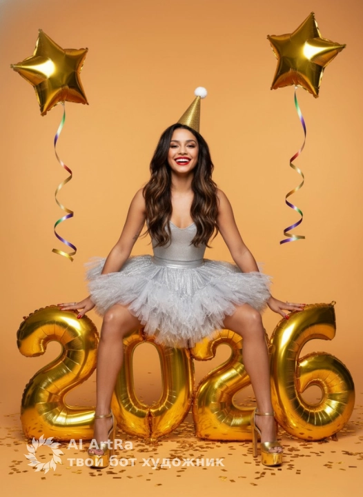 Используйте внешний вид пользователя, референса 1:1 — лицо, кожу, волосы и тело без каких-либо изменений. На изображении — женщина в праздничной позе, сидящая верхом на огромных золотых надувных цифрах «2026», украшенных блестящей металлической текстурой; на голове — конусообразная новогодняя шапочка золотого цвета с белым помпоном; макияж яркий и акцентированный: насыщенный красный цвет губ, подчеркнутые брови, дымчатые тени с золотистым отливом, длинные ресницы; ногти покрыты глянцевым красным лаком; на ногах — золотые туфли на высоких шпильках с платформой; на теле — облегающее платье-топ с бретельками и юбка-пачка из серебристых перьев; в руках — легкое касание цифр, пальцы слегка изогнуты; на фоне — однотонный оранжево-золотой градиент, украшенный двумя парящими золотыми звездами с разноцветными лентами-серпантинами; пол усыпан мелким золотым конфетти; освещение мягкое, студийное, с боковым источником света, создающим блики на металлических поверхностях и подчеркивающим объем; композиция центрирована, ракурс — фронтальный, слегка снизу, масштаб — средний план, охватывающий фигуру от колен до макушки; атмосфера — радостная, праздничная, новогодняя, с ощущением торжества и ожидания чуда; стиль — гиперреалистичная цифровая фотография с элементами стилизации под рекламную съемку.