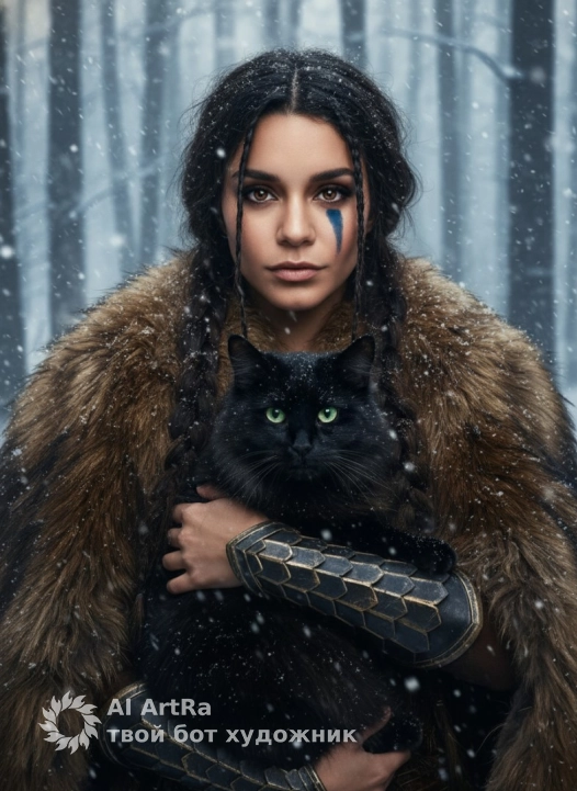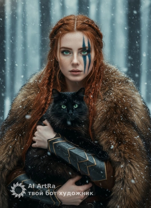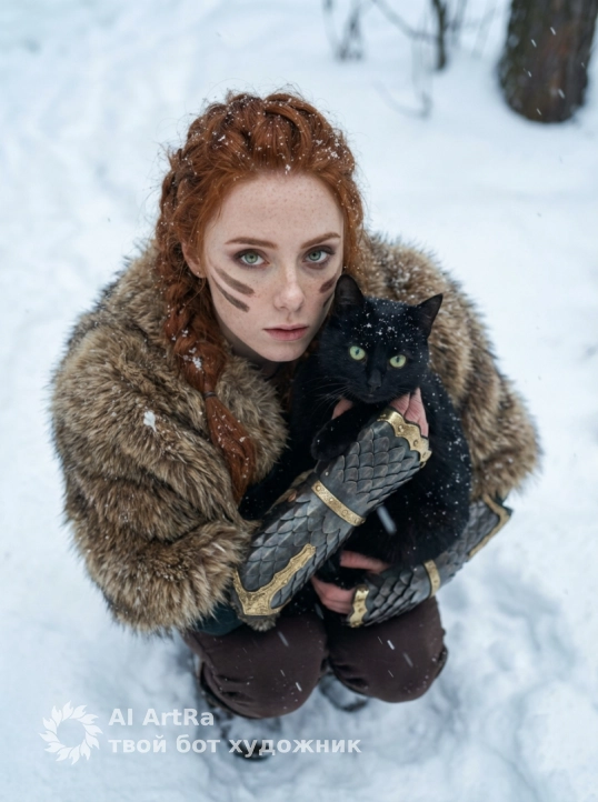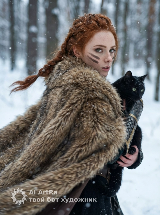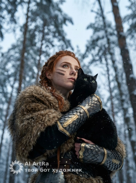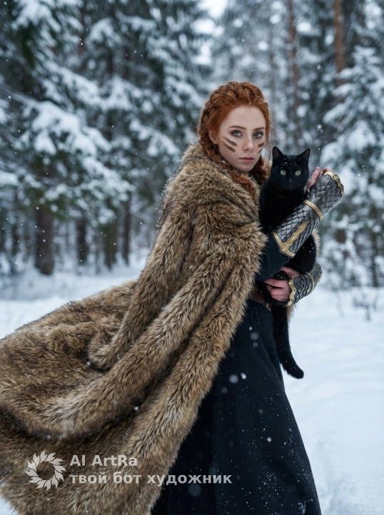 Это изображение передает ощущение силы, тайны и глубокой связи между человеком и природой в холодном, магическом мире.Use the user's appearance 1:1 — face, skin, hair and body without any changes.