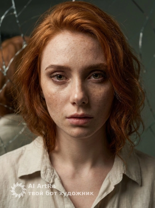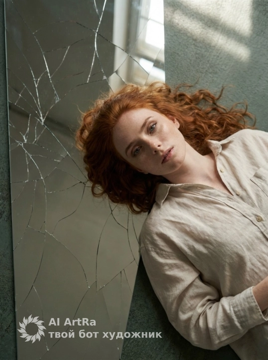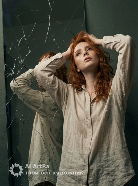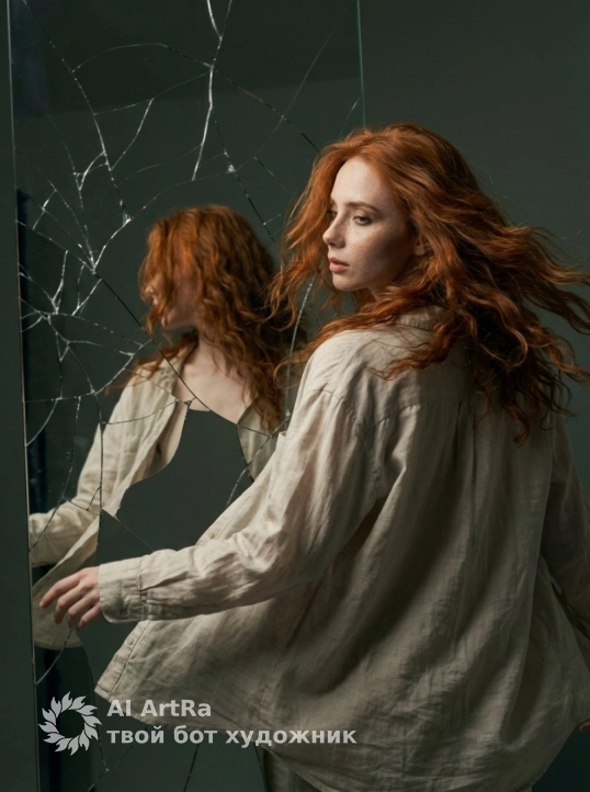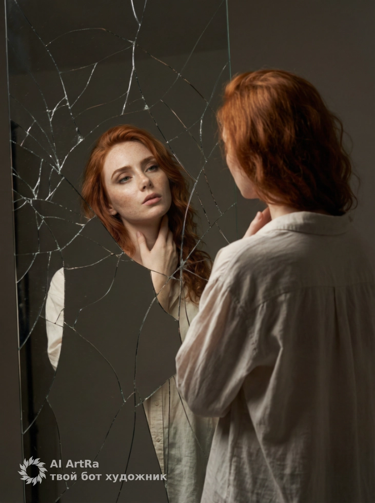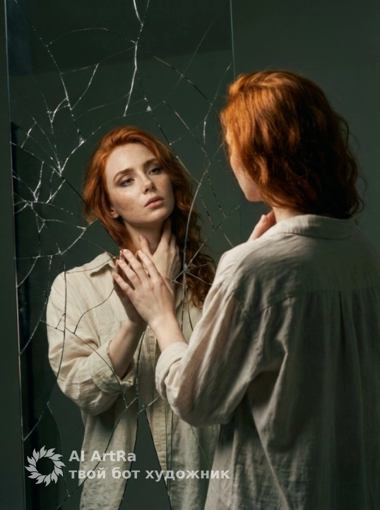 Работа с референсным фото позволит сохранить все детали вашего образа, от макияжа до выражения лица, создавая впечатление, что вы сами стоите перед большим зеркалом, обрамленным трещинами. Ваше отражение будет таким же, как на исходной фотографии, но облеченное в новый контекст, позволяя зрителю увидеть не только внешность, но и внутренний мир.