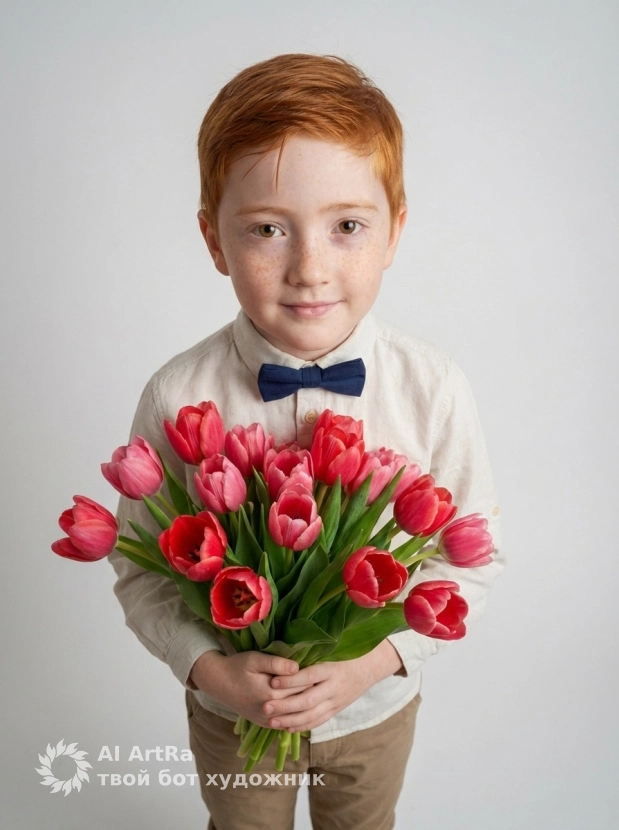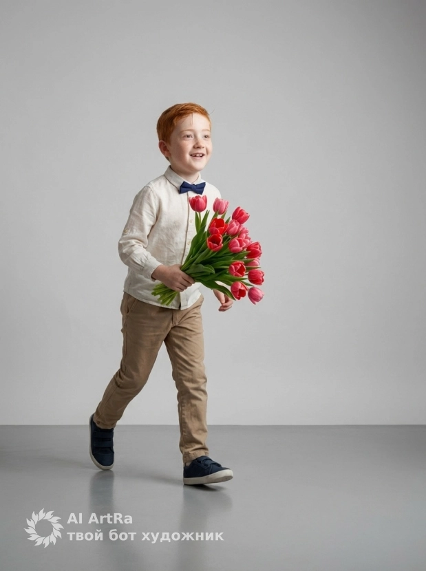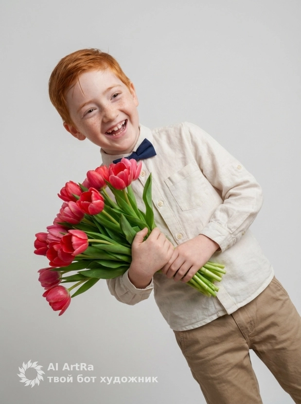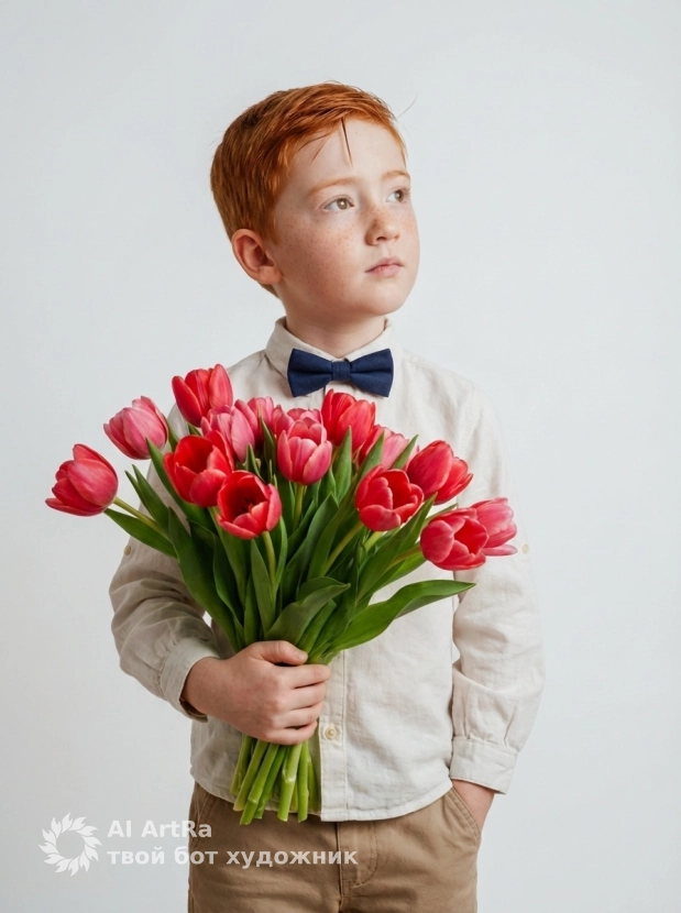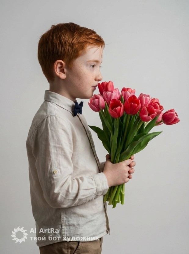 Ищете способ выделиться в digital-пространстве? Фотосессия, созданная в ARTRA, — это ваш шанс стать выразителем собственного стиля и индивидуальности. Независимо от того, хотите ли вы представить себя как юного джентльмена с букетом тюльпанов, или у вас есть свои идеи, наш сервис позволяет легко адаптировать промпт под ваши пожелания. Мы рекомендуем использовать Nano Banana PRO для достижения максимального качества и непревзойденного результата.