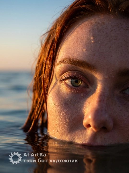 Используйте внешний вид пользователя, референса 1:1 — лицо, кожу, волосы и тело без каких-либо изменений. Крупный план лица, частично погруженного в воду, с акцентом на глаз, густые ресницы, естественно очерченные брови, кожа с едва заметными веснушками, покрыта капельками воды и отблесками золотистого закатного света, создающими эффект влажного сияния; макияж отсутствует, маникюр и украшения не видны; фон — размытое море и небо на закате, с мягкими переходами от тёплых оранжевых к холодным синим тонам; освещение — боковое, низкое, солнечные лучи создают контрастные блики и глубокие тени, подчеркивая текстуру кожи и волны; стиль — гиперреализм с элементами цифровой живописи, высокая детализация кожи, воды и отражений; ракурс — чуть снизу, взгляд направлен прямо в камеру, создавая ощущение интимности и проникновенности; кадр — тесный, обрезанный по линии воды, фокус на глазе и носу, остальное — в мягком боке; атмосфера — спокойная, мечтательная, с ноткой уязвимости и естественной красоты; одежда не видна, поза — неподвижная, голова слегка наклонена, словно человек только что вынырнул или замер в ожидании.