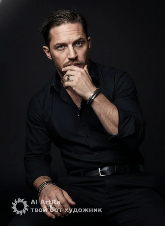 His attire includes a black, long-sleeved button-down shirt, black pants, and a black belt. The lighting is soft yet dramatic, with subtle accents highlighting the facial features and creating subtle shadows that define the contours of the jaw. Highly detailed, photorealistic, shot on an 85mm portrait lens.