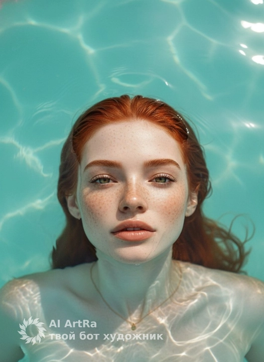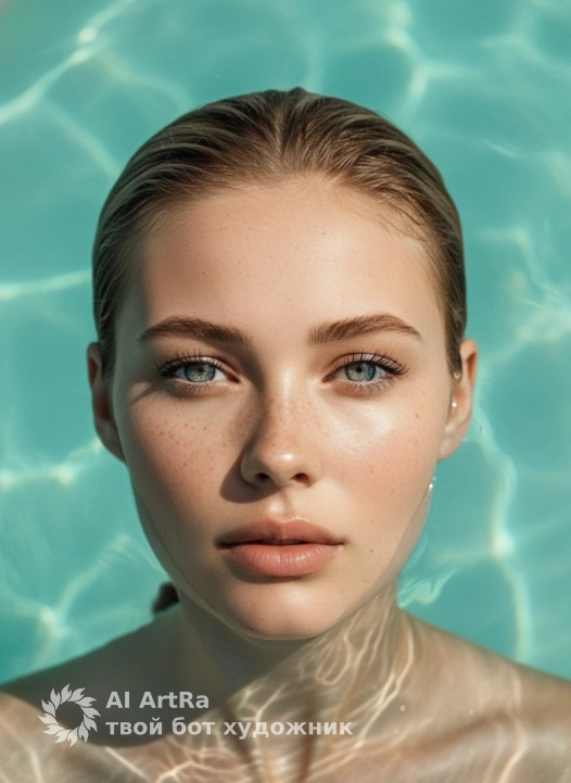аква beauty‑портрет, профессиональный кадр на фотоаппарат: лицо девушки наполовину в бирюзовой океанической воде, фото с высокого ракурса мокрые волосы зализаны назад, нюдовый глянец, лицо без изменений , выразительные глаза и длинные ресницы; крупный план, симметрия, мягкий свет, высокая резкость, фотореализм, фото в стиле журнальной съемки