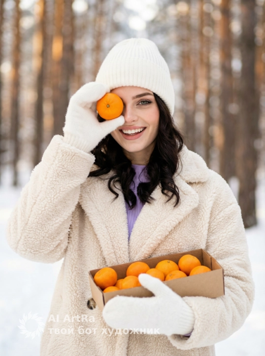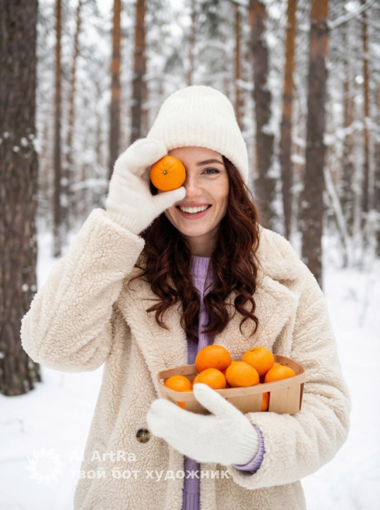 Зимний lifestyle‑портрет в сосновом лесу: молодая женщина в белой вязаной шапке и белых варежках, пушистая шуба‑тедди айвори; волнистые волосы, нюдовый макияж, черты лица без изменений. Она держит картонный лоток с мандаринами и прижимает один мандарин к глазу как «монокль», широко улыбается. Под шубой видна лавандовая кофта. Фон — мягкий боке из тёплых стволов деревьев и холодного снега; яркий чистый зимний день, рассеянный свет без жёстких теней. Палитра: белый/айвори + яркий оранжевый, тёплые тона кожи, тёмные волосы. Вертикаль 4:5, кадр по грудь, центр‑композиция; неглубокая ГРИП, акцент на лице и фруктах. фотореализм. Use the user's appearance 1:1 — face, skin, hair and body without any changes.