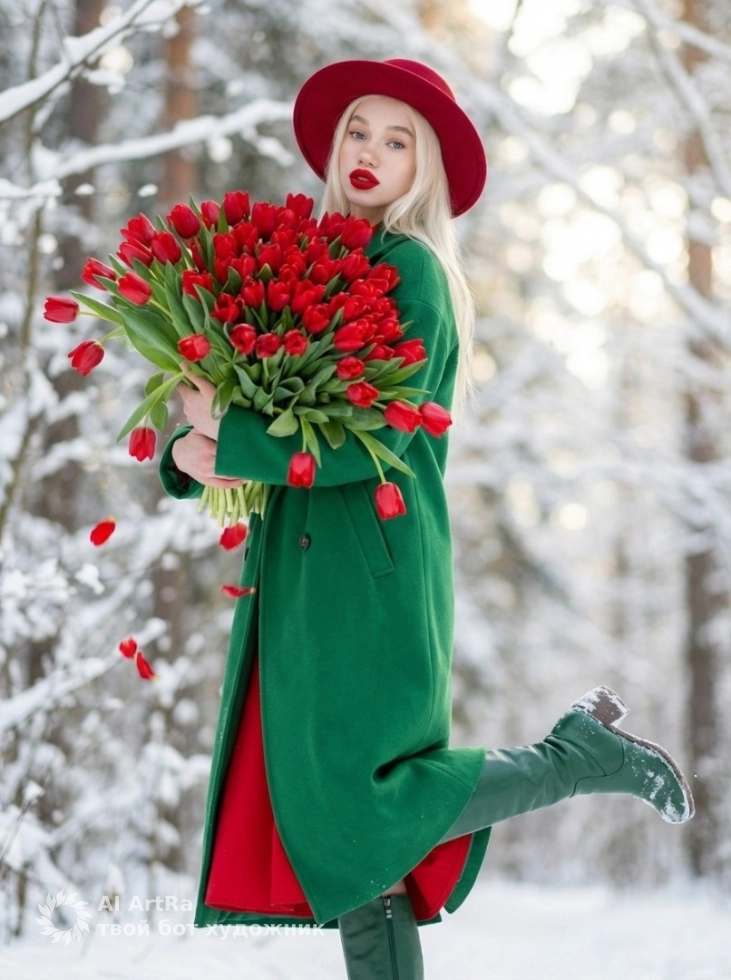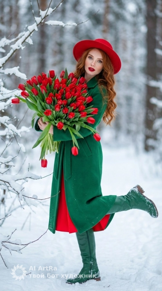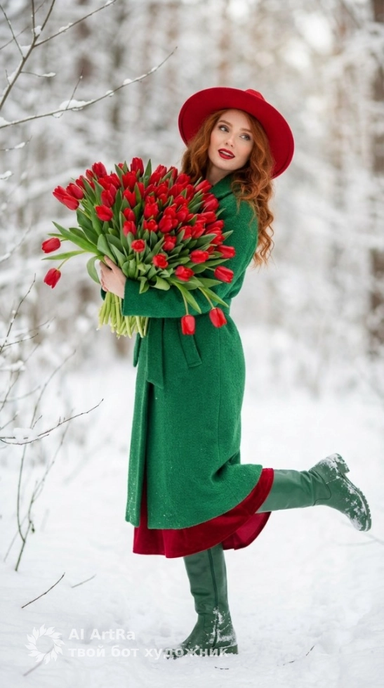 Представьте себя в живописном снежном лесу, где вы можете быть не просто моделью, но и главным героем своего собственного праздничного романа. Восхищайте окружающих яркими образами: изумрудно-зелёное пальто и алые тюльпаны создадут незабываемый контраст с белоснежным фоном.